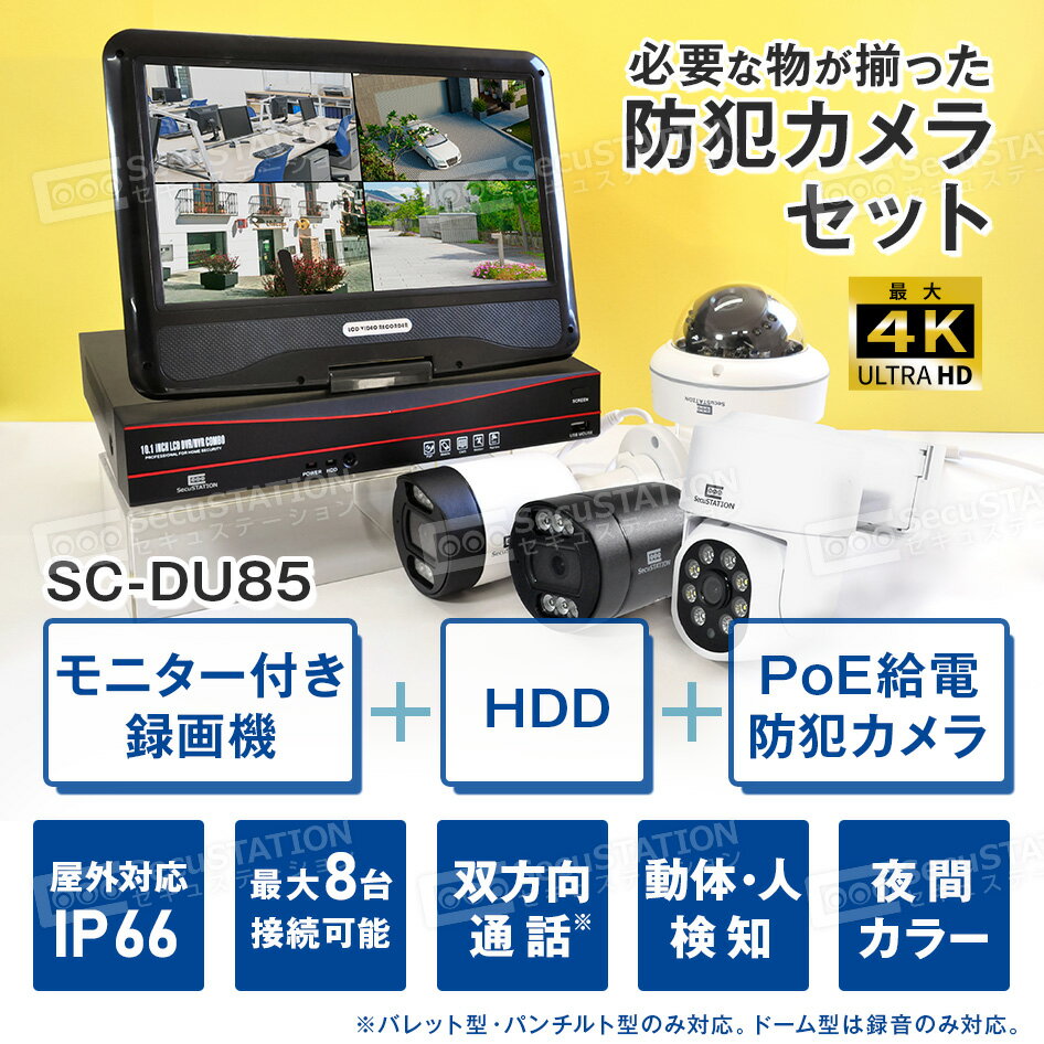 SALE【最大4K モニター付き録画機 PoE4台セット★2TB→3TBへ無料アップグレード】 防犯カメラ 屋外 モニターセット 録画装置 800万画素 室内 家庭用 業務用 ライト 夜間カラー 暗視 動体検知 録画 スマホ パソコン対応 遠隔 通知 wifi ネット 不要 有線 4台 セット DU85K