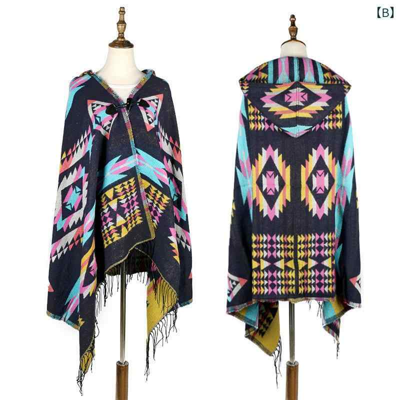 レディース ショール 大判 フード 細長長方形80*200cm ストール コート代わり マント 暖かい 保温 ボヘミアン エキゾチック幾何学模様 エスニック 民族調 エレガント おしゃれ