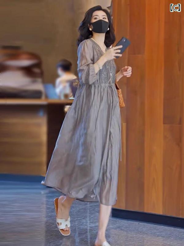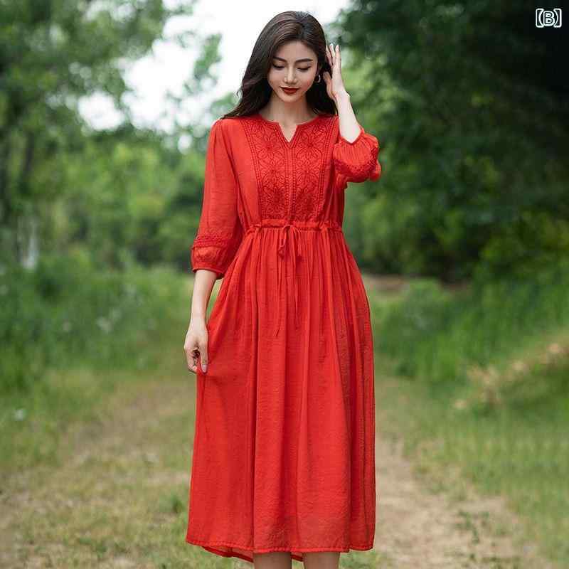 レディース 夏 ワンピース おしゃれ アジアン スタイル 文学 レトロ V ネック 刺繍 お腹り カバー 七分丈 ランタン スリーブ ミドル丈 ドレス 女性