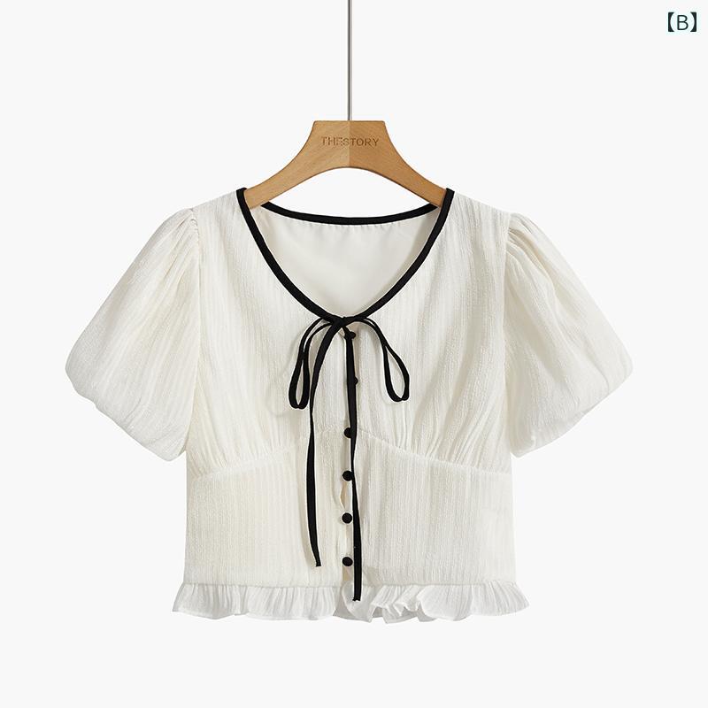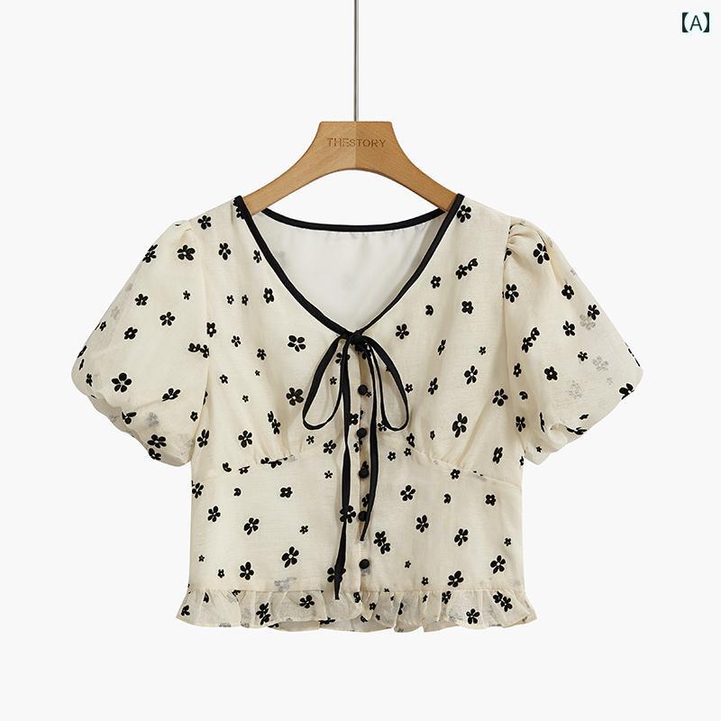 トップス シャツ レディース ファッション カジュアル 普段使い 花柄 夏 Vネック タイ ウエスト ショート パフ スリーブ フリル 半袖