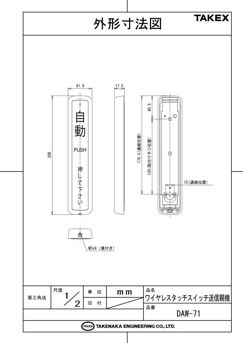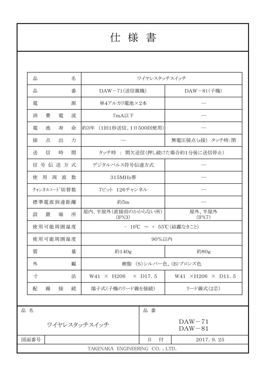【DAW-71(S)】 ワイヤレスタッチスイッチ(送信親機) TAKEX 竹中エンジニアリング
