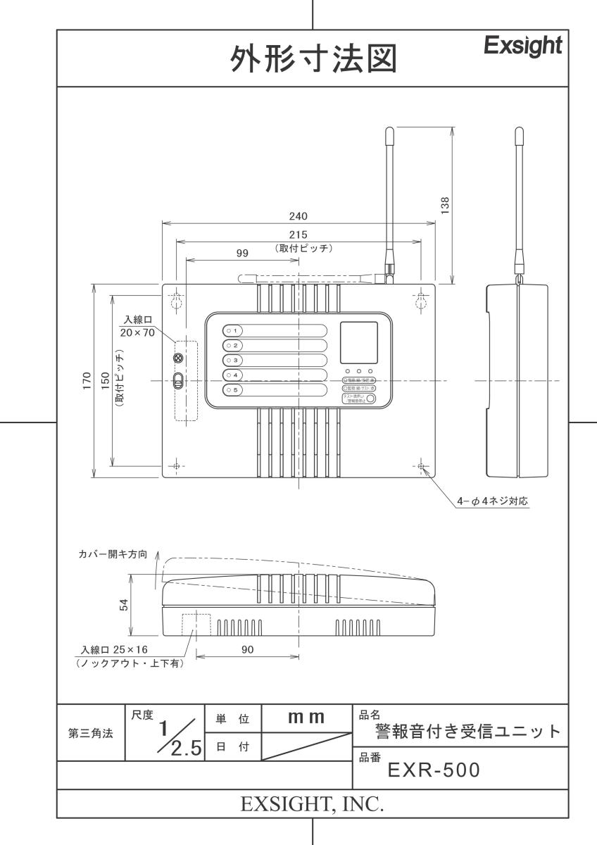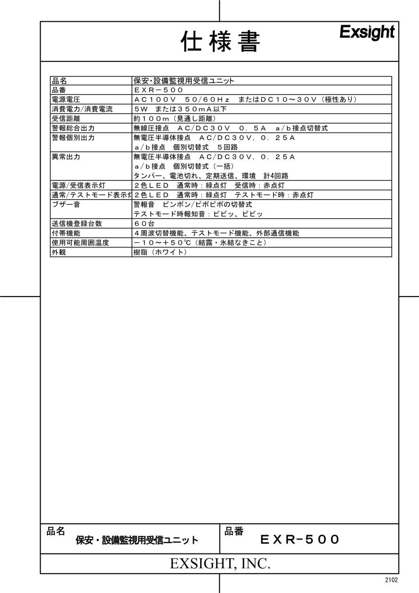 【通常在庫品】通常在庫品です。万一在庫切れの場合にはご連絡致します。保安・設備監視用受信ユニット EXR-500(4周波切替対応型) EXR-500は、倒れコールやチョコ停監視など、各種設備の異常検知・保安監視に最適な多機能5回路対応ワイヤレス受信ユニットです。 4周波切替対応により複数機器設置時の混信リスクを軽減し、最大60台の送信機登録が可能。 個別出力5回路と異常・総合出力を備え、あらゆる監視用途に柔軟に対応します。 仕様 品名保安・設備監視用受信ユニット 品番EXR-500 電源電圧AC100V(50/60Hz)またはDC10〜30V(極性あり) 消費電力/電流5W または 350mA以下 受信距離約100m(見通し距離) 警報総合出力AC/DC30V・0.5A a接点/b接点切替式(無電圧半導体接点) 警報個別出力AC/DC30V・0.25A a接点/b接点切替式(個別5回路) 異常出力AC/DC30V・0.25A a接点/b接点切替式(4回路)タンパ、電池切れ、定期送信、環境 表示灯 電源/受信表示:緑・赤LED(通常:緑点灯/受信時:赤点灯) 監視/テスト表示:緑・赤LED(監視:緑点灯/テスト時:赤点灯) 報知音 通常:ピッ/ピピピ/ピポポポ(切替可能) テスト時:ピピッピピッ 音量:無音〜約80dB(調整可能) 電池切れ通知:ピッ(20秒間隔/固定音量) 送信機登録可能台数最大60台 使用可能周囲温度-10℃〜+50℃(結露・氷結なきこと) 外観樹脂製(ホワイト) 主な機能 5回路個別出力:監視対象ごとに個別に警報出力可能 総合出力/異常出力:一括警報や異常信号にも対応 4周波切替対応:混信防止で複数台運用も安心 ワイヤレス受信距離100m:広範囲監視に対応 LED表示灯:正常/受信/テストモードを一目で確認 報知音カスタマイズ:音色切替と音量調整が可能 電池切れ警報対応:定期通知とLED表示で電源管理も安心 AC/DC両対応電源:既存設備への組込みも容易 コンパクト&視認性重視:樹脂製ホワイトボディで屋内にもマッチ EXR-500は、工場設備の異常検知や高齢者見守りシステム、施設内警報監視などにおいて確実かつ柔軟なワイヤレス受信制御を可能にする高性能5回路受信ユニットです。 視覚・聴覚通知と安定した無線通信により、安心・安全の設備管理を強力にサポートします。EXR-500は、保安監視や設備監視に特化した多機能ワイヤレス受信ユニットです。見通し通信距離約100m、4周波切替対応により電波混信を防止。a接点/b接点切替式の警報個別出力は5回路に対応し、異常出力(4回路)、警報総合出力も装備。AC/DC両対応でDC10〜30V入力にも対応する柔軟な電源仕様。LED表示灯で受信状況や異常を視認しやすく、報知音は切替・音量調整可能(最大約80dB)。電池切れ通知や環境監視・定期通信にも対応し、倒れコールやチョコ停監視など現場の多様なニーズに応える設計です。最大60台の送信機登録が可能で、広域設備監視やワイヤレス警報システム、セキュリティ対応受信器として最適な一台です。