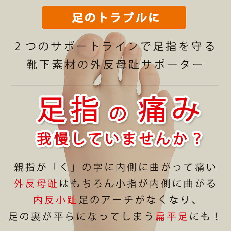 材質:ナイロン、ポリエステル、ポリウレタン サイズ S〜M:22.0〜23.5cm M〜L:24.0〜25.5cm 販売元:株式会社メイダイ 生産国:日本 ※ご注意※ 遊び糸は絶対に切らないようにお願いします。 サポーターをひっくり返すと着圧部分に数センチの糸が出ています。 これは遊び糸と言って構造上必要な糸です。 切ってしまうとほつれたり穴が開いてしまいます。 出ている糸は切らずに裏面へ入れ込んでください。■特許取得の着圧ラインで、中足関節を引き締め足指を開く& 親指を直接外側に向けるサポートライン形状とのWサポートで、親指を外側に無 理なく開きます。 ■全体に着圧があるサポーターとは異なり、必要な箇所のみ引き締めるので長時間心地よく履けます。 ■縫い目が完全に無いので重ね履きしてもごわつかず、素肌感覚の履き心地を実現。 ■靴下のように簡単に装着でき、洗濯機で丸洗いできるのでお手入れ簡単。 ■普段の靴が履ける薄手形状で通気性が良く蒸れにくい。 ■足首のサポートラインで足首部を固定し脱げにくく、グラつきを防止し歩行を助けます。