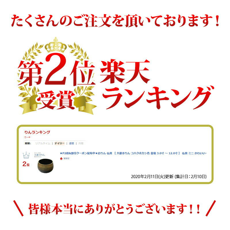 大徳寺りん コハクボカシ色 金環 3.0寸〜12.0寸 商品説明 大きく響く伝統的な本手打ちリンです。 ※7.0寸〜12寸の大きいサイズは、お届けに2〜3週間かかります。 お急ぎの際は、別途ご連絡ください。 ■おリンのサイズ サイズ直径 3.0寸約 9.0cm 3.5寸約10.5cm 4.0寸約12.0cm 4.5寸約13.5cm 5.0寸約15.0cm 6.0寸約18.0cm 7.0寸約21.0cm 8.0寸約24.0cm 9.0寸約27.0cm 10.0寸約30.0cm 12.0寸約36.0cm