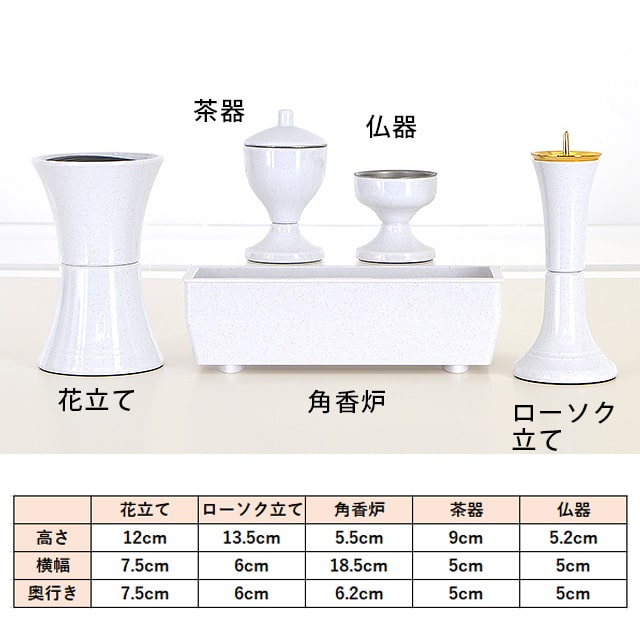 ビクトリー 白 8具足セット 商品説明 コンパクトなお仏壇にとてもよく似合う、プラスチック製の仏具セットです。とても軽いので誤って落としてしまっても割れにくく、安心してお使いいただけます。 長香炉・ローソク立て・花立て・茶器・仏器・天目・三宝、おりんの8点セットです。 ※花立は造花用です。 ※実際の商品とWEB上の写真は若干色が異なる場合がございます。また、メーカーの意向により、予告無くデザインの変更、または生産終了となる場合がございますので、予めご了承下さいませ。 寸法 高さ 横幅 奥行き 花立て 12cm 7.5cm 7.5cm ローソク立て 13.5cm 6cm 6cm 角香炉 5.5cm 18.5cm 6.2cm 茶器(お水入れ) 9cm 5cm 5cm 仏器(ご飯入れ) 5.2cm 5cm 5cm 天目 1.5cm 17cm 7cm 三宝 2.5cm 19.5cm 11cm リン 8cm 10cm 6.7cm