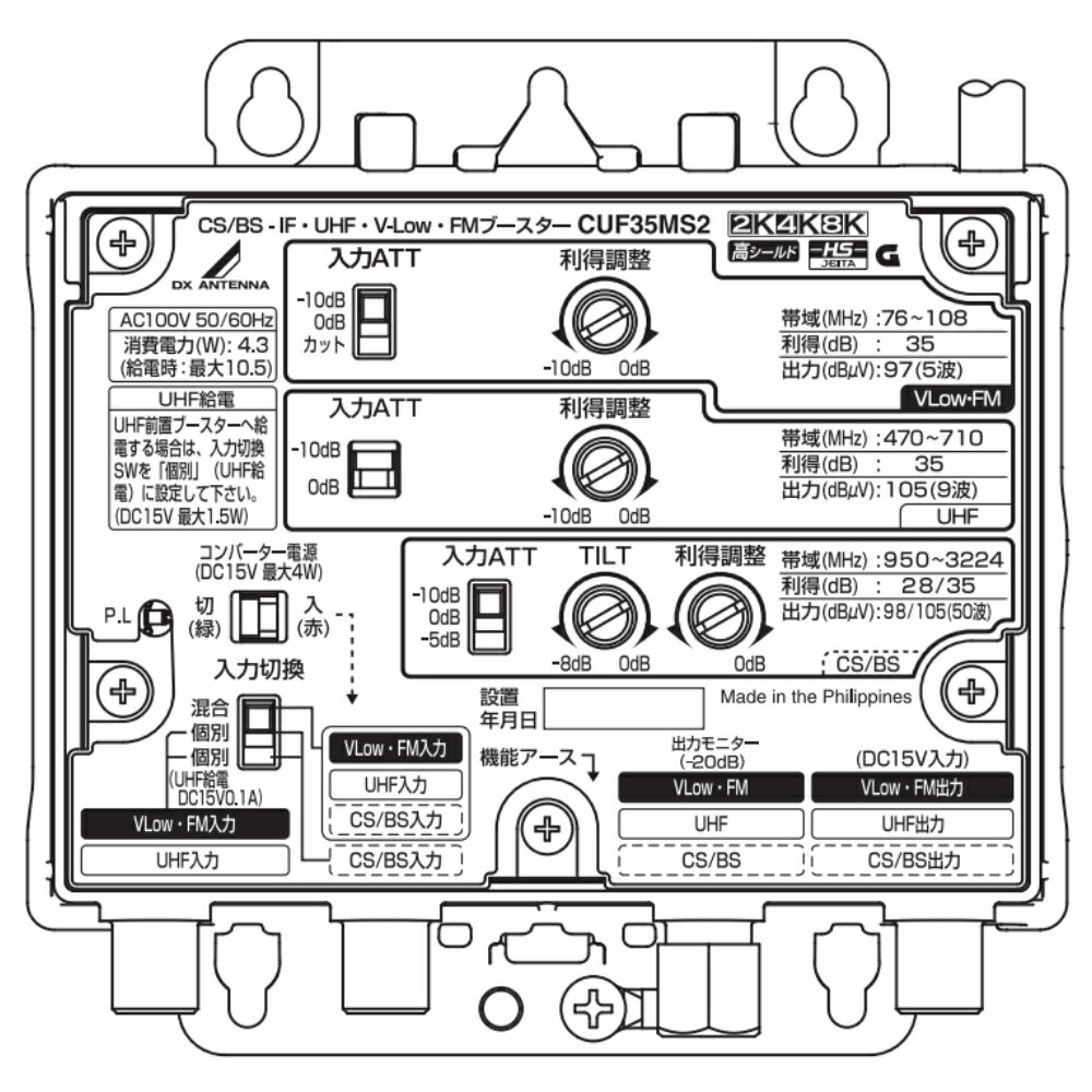DXアンテナ 共同受信用 UHF・FM・BS/CSブースター 4K・8K対応 35dB 新型CUF35MS2 (旧CUF35MS)