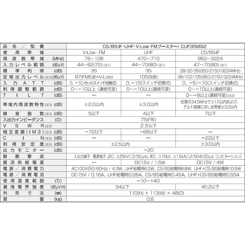 共聴ブースターはアンテナ機器専門店の当店におまかせください! デジタル放送対応品 使用チャンネル:13〜52ch 入出力インピーダンス:75Ω(F型) ◆周波数帯域FM:76〜108MHz UHF:470〜710MHz CS/BS-IF:950〜3224MHz ◆標準利得FM:35dB UHF:35dB CS/BS-IF:28/32/35(950/2150/3224MHz値) 外形寸法:110mm(H)×113mm(W)×48mm(D)質量:0.8kg 電源ケーブル:約90cm 出力モニタ付 ・電源/消費電力:AC100V(50/60Hz)4.3W UHF給電時6.0W、CS/BS給電時8.8W、UHF・BS/CS給電時10.5W ※沖縄・離島は別途送料をご負担頂きます。