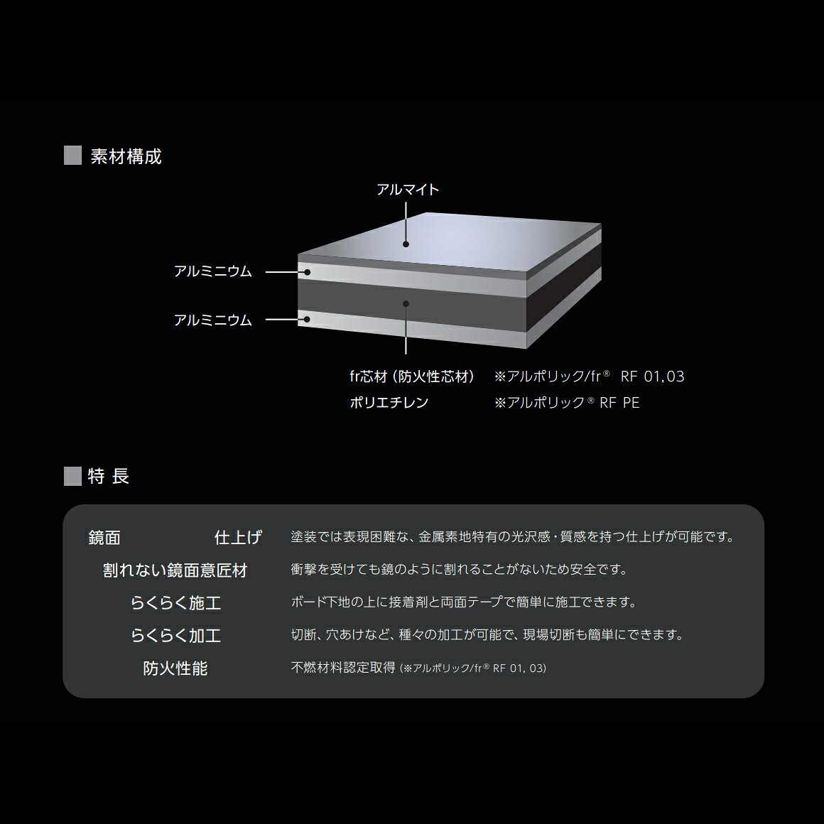 厚み3mm 不燃認定取得品 新素材!割れない鏡 ALPOLIC fr RF 01 防火性fr芯材使用。 ALPOLIC fr RF 01は従来のガラス鏡等と比較して 軽量、安全性(割れない)、加工性、不燃性に優れます。 防火性芯材をアルミ板で挟み、片側表面をアルマイト鏡面加工してあります。 店舗内装飾や、近年増えているダンスレッスンスタジオの鏡としてもおすすめです。 ※ALPOLIC fr RF 01は屋内専用となります。 ※曲げ半径1000R(単位/mm)以上での曲げ加工が可能です。