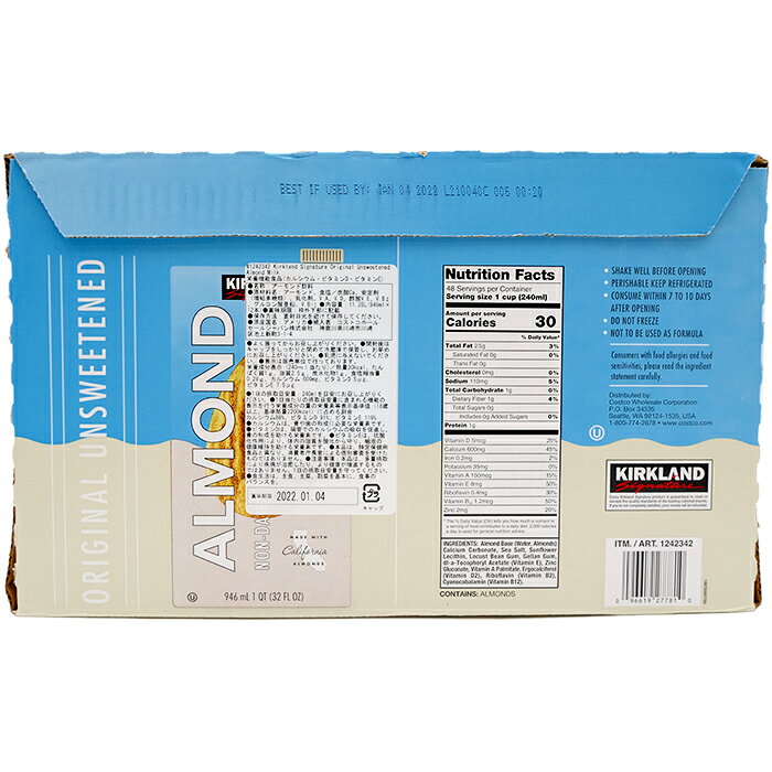 商品説明 商品名 Kirkland Signature Original Unsweetened Almond Milk 栄養機能食品(カルシウム・ビタミンD・ビタミンE) 名称 アーモンド飲料 原材料名 アーモンド、食塩/炭酸Ca、 安定剤(増粘多糖類)、乳化剤、 V.A、V.D、酢酸V.E、V.B2、 グルコン酸亜鉛、V.B12 内容量(1箱) 11.35L(946ml × 12本) 保存方法 直射日光を避けて保存してください。 原産国名 アメリカ 輸入者 コストコホールセールジャパン株式会社 〒210-0832 神奈川県川崎市川崎区池上新町3-1-4 商品説明 ☆人気!品薄!アーモンドミルク(無糖)☆ 946ml×12本入りケースが2箱セット! たっぷりサイズをリーズナブルに味わえるのが魅力♪ 常温保存もできるので便利です♪ 栄養機能食品で健康に良いとして注目されている アーモンドミルク! カルシウム・ビタミンD・ビタミンE等が豊富☆ 無糖の自然な甘みがある味わいで、 そのまま飲むこともできます! シリアルにかけたりスムージー等に合わせたり等、 健康的に美味しく頂ける人気アーモンドミルクです♪ ご購入におけるご確認事項 ※賞味期限の日数が短い等による返品・交換は受けかねます。 何卒、ご理解賜りますようお願い申し上げます。 ※賞味期限に不安があるお客様は必ずお問い合わせください。 ※予告なくパッケージデザイン、内容が変更となる場合がございます。 ※当サイトの内容、テキスト、画像等の無断転載・無断使用を固く禁じます。