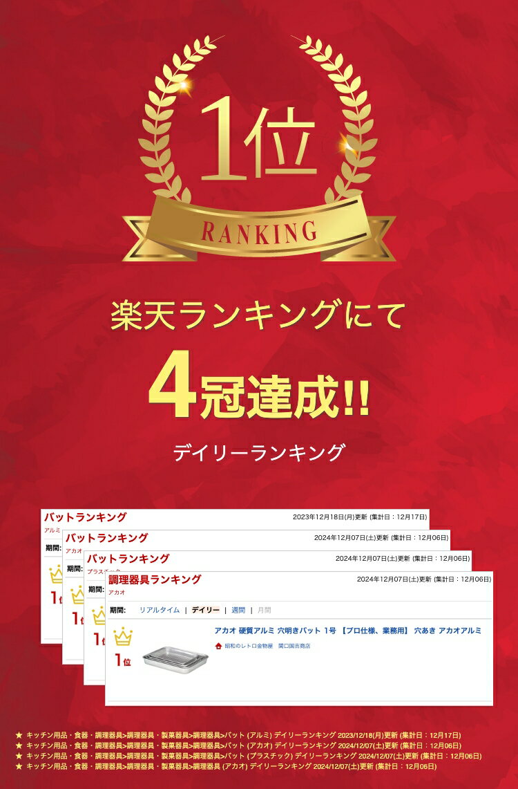 商品名 アカオ 硬質アルミ 穴明きバット 1号 【プロ仕様、業務用】 穴あき アカオアルミ メーカー アカオアルミ(AKAO) サイズ 外寸法 370mm×307mm×45mm 板厚 0.8mm 材質 硬質アルミ 軽くて丈夫な硬質アルミを使用。耐食性や耐磨耗性優れ、普通アルミ材に対し2倍以上の強度。 アルミの熱伝導率は、スチールの3倍、ステンレスの13倍、プラスチックの448倍と他素材に比べて大変優れているので、スピード冷凍・解凍ができます。穴明きバットは他のバットと組み合わせても使用できます。関連商品アカオ 硬質アルミ 標準バット深型 2号 【プロ仕様、業務用】 アカオ...アカオ 硬質アルミ 大型バット 大 【プロ仕様、業務用】 アカオアルミ.../即納/ アルミ バット システムバット蓋 大 日本製 アカオ / 餃...1,996円1,996円2,040円/即納/ アルミ バット システムバット 40 小小 日本製 アカオ ...アカオ 硬質アルミ D型バット 32cm 【プロ仕様、業務用】 アカオ.../即納/ アルミ バット システムバット蓋 小 日本製 アカオ / 餃...2,200円2,198円1,730円アカオ 硬質アルミ 大型バット P 【プロ仕様、業務用】 アカオアルミ.../入荷待ち/ アカオ 硬質アルミ 深バット 小 【プロ仕様、業務用】 ...アカオ 硬質アルミ 穴明きバット 4号 【プロ仕様、業務用】 穴あき ...2,234円2,003円1,284円/即納/ クイッキー アカオ 冷凍 アルミ 保存容器 浅型 特大 / .../即納/ クイッキー アカオ 冷凍 アルミ 保存容器 深型 大 / 急.../即納/ クイッキー アカオ 冷凍 アルミ 保存容器 深型 中 / 急...2,236円1,734円1,720円