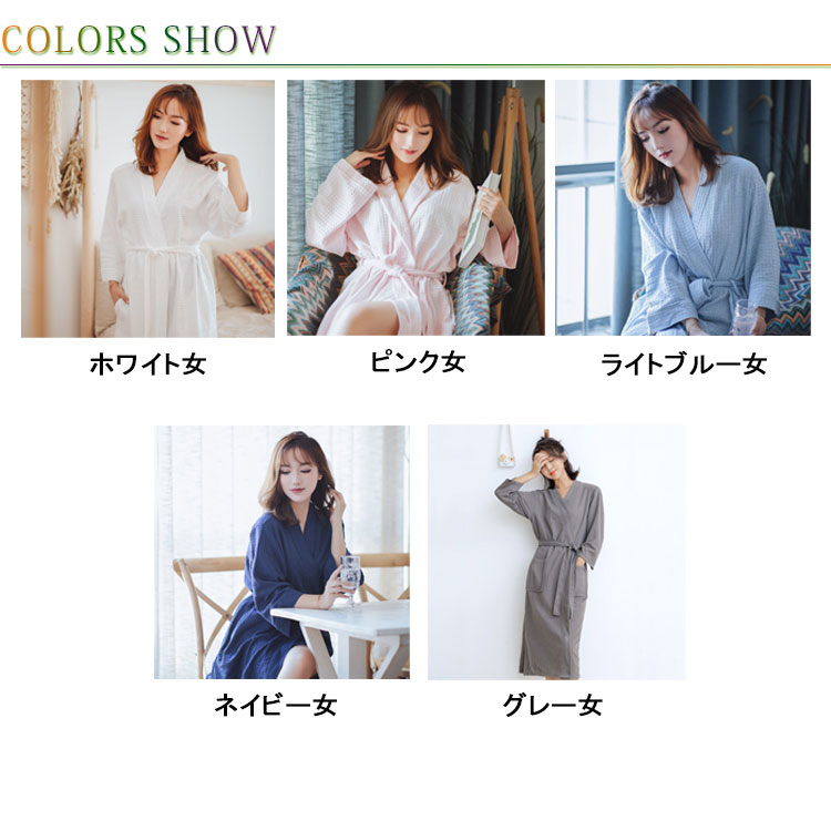 ふわっとした弾力ある肌触り感のバスローブなめらかで、軽くて、着た瞬間暖かく感じられる生地を使用男女問わず着用できるので、家族でシェアしたり、友人や恋人へのプレゼントにも最適です。ご自宅の洗濯機で丸洗いOK。安心して気軽に毎日使えます。 サイズ M L XL 2XL サイズについての説明 M肩幅44バスト110着丈95おすすめ体重35-60kgL肩幅48バスト115着丈105おすすめ体重60-75kgXL肩幅52バスト125着丈115おすすめ体重75-90kg2XL肩幅56バスト130着丈120おすすめ体重90-110kg※サイズは平置き実寸になります。サイズ表の実寸法は商品によって1-3cm程度の誤差がある場合がございます 素材 ポリエステル 色 ホワイト女 ピンク女 ライトブルー女 ネイビー女 グレー女 ホワイト男 ライトブルー男 グレー男 ネイビー男 備考 ●サイズ詳細等の測り方はスタッフ間で統一、徹底はしておりますが、実寸は商品によって若干の誤差(1cm・3cm )がある場合がございますので、予めご了承ください。 ●商品の色は、撮影時の光や、お客様のモニターの色具合などにより、実際の商品と異なる場合がございます。あらかじめ、ご了承ください。 ●製品によっては、生地の特性上、洗濯時に縮む場合がございますので洗濯時はご注意下さいませ。 ▼色味の強い製品によっては他の衣類などに色移りする場合もございますので、速やかに(脱水、乾燥等)するようにお願いいたします。 ▼生地によっては摩擦や汗、雨などで濡れた時は、他の製品に移染する恐れがございますので、着用の際はご注意下さい。 ▼生地の特性上、やや匂いが強く感じられるものもございます。数日のご使用や陰干しなどで気になる匂いはほとんど感じられなくなります。 メーカー希望小売価格はメーカーカタログに基づいて掲載しています 不良品についての説明基づいて掲載しています