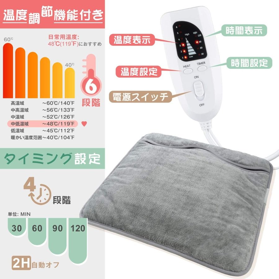 【最新版電気マット】※使用中に安全のために2時間ずつ自動断電することがありますが、故障ではないでご了承ください。電気マットは40 cm x 40 cmになるように設計されており、さまざまなシーンに使用できます。従来のホットマットと違って袋模様をデザインしています、電熱フットウォーマーとして使用できます。【省エネ&安全保証】40℃-60℃範囲に6つ段階に調節されます、ご自由に温度を切り替えられる。タイマー機能を備えて、30から120分の4タイマー自動シャットオフがあります。当社の電熱マットはPSE認証済みで五重発熱保護層があります。リアルタイム監視、絶縁保護、難燃性保護、回線保護、過熱保護の五つです。過熱・電圧異常の場合、すぐ自動的に電源を切り、過度の加熱による火傷を防ぎます。1時間あたり約15Wを消費します。1時間あたり約0.3・0・5円の電気代です。【過熱防止&省エネ】PSE認証済み。ホットマットは五重発熱保護層があります。リアルタイム監視、絶縁保護、難燃性保護、回線保護、過熱保護の五つです。 不良品についての説明基づいて掲載しています