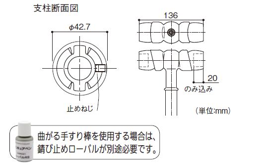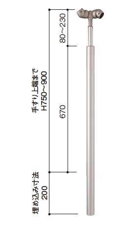 ※一部の直送品に関しまして、北海道・沖縄県・離島への発送をお受けできない場合がございます。誠に恐れ入りますが、当店にてご注文をキャンセルさせていただく場合がございますので、予めご了承下さい。 手すりの折れ曲がり部分や階段の上下端に。 施工の手間を省き、支柱本数の削減もできます。 サイズ:φ42.7×支柱高さ750から900mm(埋込み寸法200mm以上) 材質:アルミ合金・アルミ型材 色:ステンカラー色(040-2827)、ダークブロンズ(040-2885) 付属品:手すり固定用丸皿タッピンねじ(4×20)2本、六角棒スパナ(呼び3、5)各1本、防水パッキン2個 埋込み用コア抜きはφ60mmでOK 手すり棒必要下穴径:φ3.3mm ※化粧カバーは埋め込み式支柱用化粧カバー、又は埋め込み式支柱用化粧カバー後付けをご使用ください。 ※曲がる手すり棒を使用する場合は、錆び止めローバルが別途必要です。