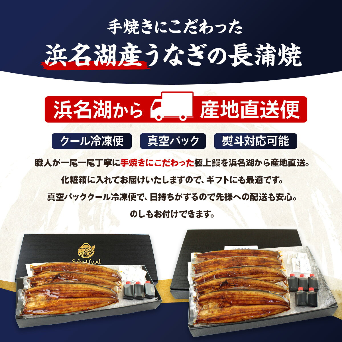 100% 国産(浜名湖産)の安心安全なうなぎのみを使っています。 商品内容 浜名湖産うなぎの蒲焼2~6本(ご購入の際に本数を選択してください) サイズ 1本=約130g(130グラムを数グラム下回る場合もございます。予めご了承ください) 産地 静岡県浜松市(浜名湖=国産) 原材料 国産ウナギ(浜名湖産)、しょうゆ(小麦・大豆を含む、国内製造)、発酵調味料、砂糖、水飴/カラメル色素、酒精、調味料(アミノ酸等)、V,B1 商品の状態 真空パック・冷凍 賞味期限 冷凍保存 1ヶ月、解凍後は3日 栄養成分表示(100gあたり)推定値 熱量:350kcal、たんぱく質:24.0g、脂質:25.2g、炭水化物:6.7g、食塩相当量:1.2g 熨斗・包装について 全て化粧箱にお入れして発送いたします。 2本入、3本、4本入は化粧箱にお入れした後、透明ビニールの圧着をして発送いたします。のしをご利用の場合は、お箱に短冊熨斗をお付けいたします。外熨斗のみとなります。 5本入、6本入の場合は、大きめの化粧箱にお入れし、包装して発送いたします。のしは包装紙の上にお貼りいたします。外熨斗のみとなります。 商品特長 純国産の浜名湖産うなぎ蒲焼き。浜名湖のほとりで徹底管理されて養殖された安心安全なうなぎです。浜名湖の温暖な環境の中、ストレスを感じることなく生き生きと育ったうなぎは、旨味たっぷり。「美味しいうなぎを召し上がっていただきたいという想いから、水質、餌の時間、温度管理など、うなぎの生育のためにきめ細かな管理を徹底することで、健康で質の高いうなぎを養殖しています。 浜名湖周辺の快適な環境のもと、地下100メートルからくみ上げた天然地下水で泥抜きをしています。ミネラルたっぷりな綺麗な水をたっぷりと使うことで、臭みなく、美味しいうなぎにしあがるのです。 調理方法 電子レンジ・湯煎などで温めてお召上がり下さい。凍った状態から電子レンジで約1分30秒。手軽にうなぎの蒲焼をお召し上がりいただけます。 さらに本格的にお召し上がりいただきたい方向けに、レシピのしおり付き。グリル・トースター・フライパンなどで温め、表面をパリッと香ばしく、さらに美味しくお召し上がりいただける説明書をお入れいたします。 注意事項 うなぎには魚の特性上、骨がございます。当商品は蒸しておりません。「焼き」工程のみのため、うなぎ本来の柔らかさとなります。小骨が気になる場合がございますので、ご了承ください。 熟練の職人が、うなぎの個体ごとに焼き加減を見極め、一尾一尾丁寧に確認しながら手焼きしています。うなぎ本来のふっくらとした食感が失われぬよう、焼き時間を見極め、両面にタレを塗りながらじっくりと焼き上げています。 配送について ヤマト運輸・クール冷凍便での配送です。 追加送料をいただく場合がございます。 ※沖縄・離島=1100円 北海道=550円を頂戴しております。予めご了承ください。 贈答・ギフトにご利用ください お祝い事や記念日などのご利用に喜ばれています。 ギフト プレゼント お中元 暑中見舞い 残暑見舞い お歳暮 冬ギフト ウインターギフト お年賀 誕生日 父の日 母の日 敬老の日 七五三 還暦 米寿 福寿 内祝 お見舞い 退職祝 結婚祝 出産祝 出産内祝 誕生日 結婚記念日 合格祝 入社祝 卒業祝 成人祝 退院祝 快気祝 御礼 帰省土産 国内産 土用丑 土用の丑の日 真空 国産 国産うなぎ 浜名湖産 浜名湖うなぎ 浜名湖 うなぎ 冷凍食品 肉厚 うなぎ蒲焼き 蒲焼き 専用化粧箱入 40代 50代 60代 長寿 還暦 古希 喜寿 傘寿 米寿 卒寿 白寿 百寿 御祝 母の日メッセージ メッセージカード浜名湖うなぎ 「純浜名湖産 手焼きうなぎの蒲焼」 店長より 手焼きにこだわった浜名湖産うなぎの蒲焼。大切に育て上げた品質の良い浜名湖のうなぎのみを使用した浜名湖ブランドの鰻の蒲焼です。「浜名湖産」「手焼き」にこだわった「極上の鰻の蒲焼」。希少な浜名湖産ブランド鰻を、熟練の職人が丁寧に割き、1尾1尾焼き加減を調整しながら手焼きしています。長年培ってきた技術で、鰻本来の旨味を最大限に引き出しました。外は香ばしく、中はふっくらとした蒲焼は、まさに至福の味わいです。蒸していない関西風ですが、上質なうなぎそのものの柔らかい食感をお楽しみいただける逸品です。また、甘だれをかけて食べるうな重・うな丼は絶品。「美味しかった」「また食べたい」と思える鰻です。品質の高い浜名湖うなぎをぜひご自宅で。大切な方へのギフトにも最適です。お中元、お歳暮、お祝い事など、様々なシーンで喜ばれること間違いなしです。