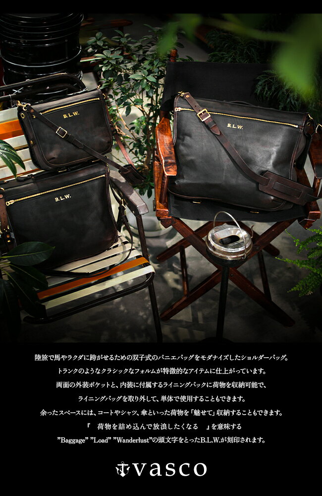 vasco -ヴァスコ- 大航海時代、新しい大陸を開拓した偉大な航海者であり探検家“vasco da gama”。旅人の飽くなき挑戦精神をモノづくりに反映させたいという想いを込め「vasco(ヴァスコ)」と命名。vasco は「旅の道具」というコンセプトの元、バッグ・革小物を創造するファクトリーブランドです。旅の道具には「淘汰されていくなかで残り続けるもの」という意味を込め、時を経ても輝きを失わないヘビーデューティーなアイテムを創造しています。HAND MADE IN JAPAN.ブランドページ>> ■vasco ヴァスコ / OLD OIL Series オールドオイル / LEATHER WANDER PANNIER BAG - MEDIUM ショルダーバッグ【VS-273L】 陸旅で馬やラクダに跨がせるための双子式のパニエバッグをモダナイズしたショルダーバッグです。汎用性の高いミディアムサイズ。トランクのようなクラシックなフォルムが特徴的なモデルです。両面の外装ポケットと、内装に付属するライニングバックにたくさんの荷物を収納できます。ライニングバッグを取り外して、単体で使用することもできます。余ったスペースには、コートやシャツ、傘といった荷物を「魅せて」収納することもできます。『荷物を詰め込んで放浪したくなる』を意味する“Baggage” “Load” “Wanderlust”の頭文字をとった B.L.W. が刻印されます。 ミモザやチェスナットから抽出されたタンニンで鞣された、姫路産フルベジタブルタンニンレザーを“丘染め”と呼ばれる伝統的なハンドメイド製法で一枚一枚丁寧に染め上げた後、オイルをたっぷり染み込ませ、独自のコガシ加工によりヴィンテージのような風合いに仕上げたオリジナルレザー「OLD OIL」を使用。使い込むほどに艶と風合いが増し、長く経年変化をお楽しみいただけます。 ※天然皮革を使用したハンドメイド製品の性質上、商品ごとにシボ感や色合いなどに多少個体差がある場合があり、摩擦、汗、水分などにより色移りする場合がございますが、天然皮革ならではの経年変化を楽しんでいただける素材となります。 ミモザやチェスナットから抽出されたタンニンで鞣された、姫路産フルベジタブルタンニンレザーを“丘染め”と呼ばれる伝統的なハンドメイド製法で一枚一枚丁寧に染め上げた後、オイルをたっぷり染み込ませ、独自のコガシ加工によりヴィンテージのような風合いに仕上げたオリジナルレザー「OLD OIL」を使用。使い込むほどに艶と風合いが増し、長く経年変化をお楽しみいただけます。裏地はヴィンテージ感漂うキャンバス素材を使用しています。 スペック ブランド |vasco / ヴァスコ シリーズ |OLD OIL Series / オールドオイル 品番 |VS-273L 形状 |LEATHER WANDER PANNIER BAG - MEDIUM |ショルダーバッグ 外寸 |W360×H280×D90(+外ポケットD40×2)[mm] 収納サイズ |A4ファイル 素材 |表地:牛革(キップレザー、カウレザー) |裏地:コットン100%(キャンバス) |付属:真鍮 / UNIVERSAL ファスナー 生産国 |Made in Japan / 日本製 付属 |ブランドロゴ入り収納袋 |※ネームタグは付属いたしません。 ATTENTION 天然皮革を使用したハンドメイド製品の性質上、商品ごとにシボ感や色合いなどに個体差がございます。天然皮革ならではの風合いとしてお楽しみください。またオイルの浸透具合により色の濃さに違いが出ることもございます。特性上、良品となりますので予めご了承ください。 摩擦、汗、水分などにより色移りする場合がございますのでご使用の際はご注意ください。 ▼ 関連商品を探す ▼ 「ヴァスコ」一覧はこちら > 「ヴァスコ ショルダーバッグ」一覧はこちら > 「ショルダーバッグ」一覧はこちら > ▼ 比較商品はこちら ▼ 100%コットン|イングランド製 牛革|日本製