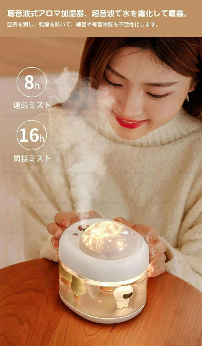 プロジェクター&加湿器&ナイトライト 3in1 プロジェクター、加湿器、ナイトライトは別々に起動出来ます。 【360度回転・USB充電式】プラネタリウム360度回転機能:動く投影がもっと面白いじゃないですか 360度ゆっくり回転し演出を更に盛り上げてくれます。 バッテリーは星空ライトに内蔵しますので、付属するUSBケーブルでパソコンや携帯電源などに接続し充電できます。 【USBケーブル・静音加湿】 USBケーブル付き、使いやすいです。 小型でシンプルなデザインなので会社や自宅でのインテリアにもなります。 【ライト搭載 雰囲気作り】 ナイトライトも搭載されて、癒しの灯りが透いて見えます。 程よい光が柔らかく照らすので、色によって異なる雰囲気を作り出しすことができます。