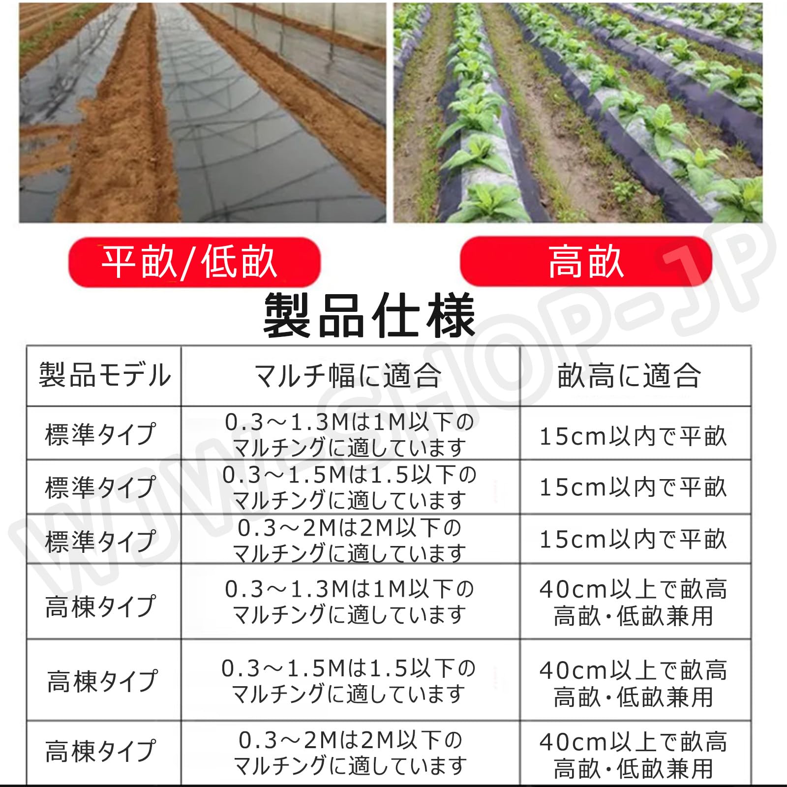 · 【操作が簡単で省力】マルチを切断する手間が不要!手押しでスムーズに作業でき、自動で土を被覆します。手作業での覆土作業が不要になり、時間と労力を大幅に節約。農作業の負担を軽減し、作業効率を向上させます。· 【調整機能充実、多様な畑に対応】フィルムの深さや幅を自由に調整可能!ホイールの高さ調節で、被覆する土の量もコントロール。高畝低畝平地など、多様な畑の地形に対応。野菜トマトピーナッツなど、幅広い作物の栽培に適しています。· 【2 種類のモデルから選択可能】「Standard」「High Ridge Model」の 2 モデルを用意。Standard は 15cm 以内の畝に、High Ridge Model は 40cm 以内の高畝にも対応。大型の防風ホイール設計で安定性が高く、畑の条件や作物に合わせて最適なモデルを選べます。· 【高品質素材で耐久性抜群】丈夫な金属素材を使用。長期間の農作業にも耐えられる耐久性を備えています。ホイールやフレームの損耗が少なく、繰り返しの使用でも安定した性能を発揮。維持費が安くて経済的な農具です。· 【マルチ敷設の最適サポート】湿地硬い地面粗い土壌には適さないため、事前に土壌を均す作業が必要ですが、適切に準備すれば、マルチの敷設を一貫してサポート。畝の形状に合わせてマルチを確実に被覆し、保温保湿雑草抑制の効果を最大限に引き出します。品質サービス:1、 当社の製品に問題がある場合は、お気軽にお問い合わせください。2、輸送中に多少の衝撃が加わる可能性がございます。万が一不具合や破損などがございましたら、部品の再送など対応させていただきますので、お気軽にご連絡くださいませ。3、商品が多いため、発送時に説明書をお送りし忘れることがございます。万が一、説明書が届いていない場合や、商品組み立てに関してご不明点がございましたら、お手数ですがご連絡いただけますようお願い申し上げます。電子版の説明書を再送させていただきますので、どうぞご安心ください。お客様にはご理解いただきますようお願い申し上げます。お客様のご支援が、私たちの励みとなっております。