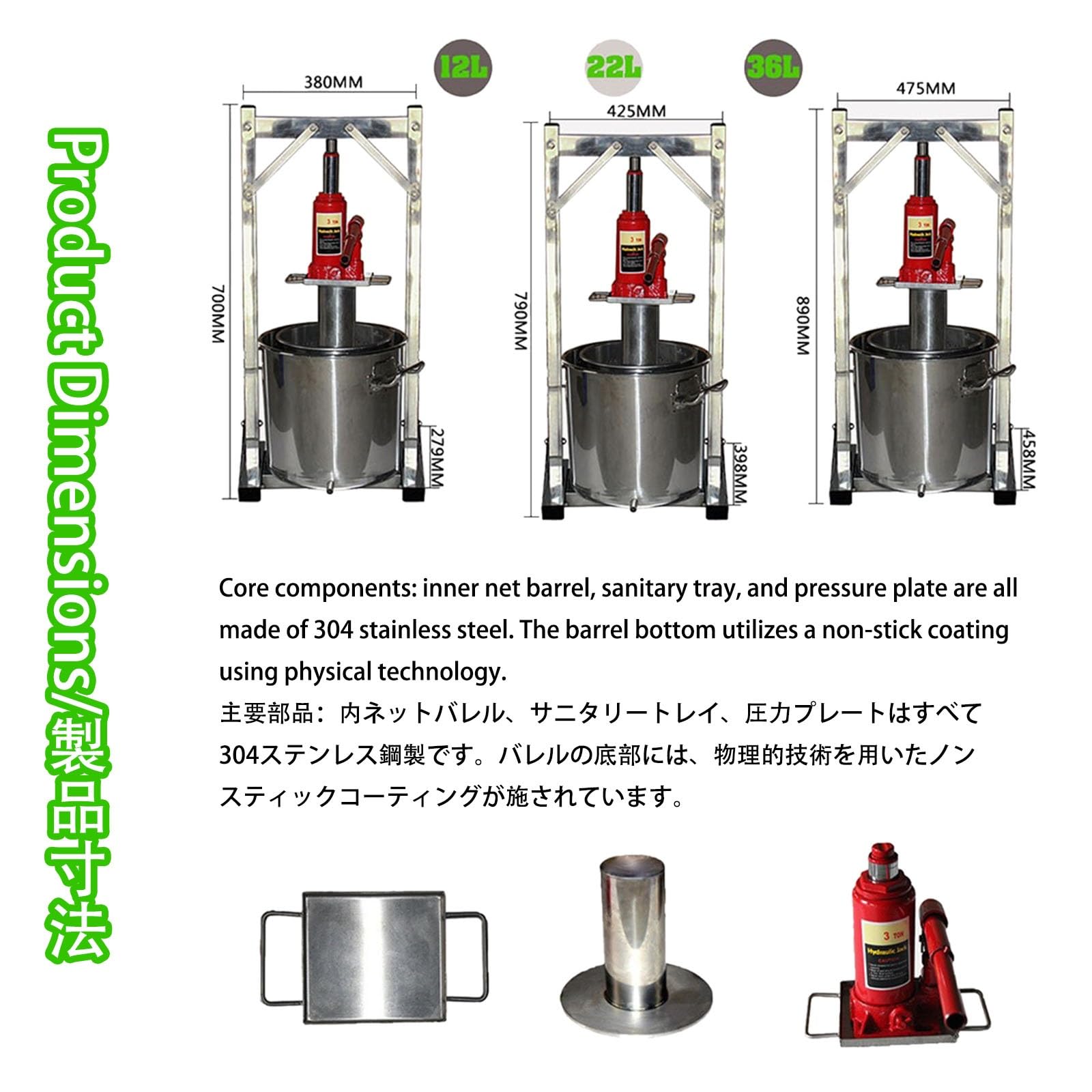 搾汁機 12-36L ワイン圧搾機 ステンレス鋼 果汁 絞り器 自家醸造機 ハニープレス抽出器、大型フルーツハニープレッサー、ステンレススチールサイダー、ワイン、ブドウ、リンゴプレス、ワインやジュース製造用品用