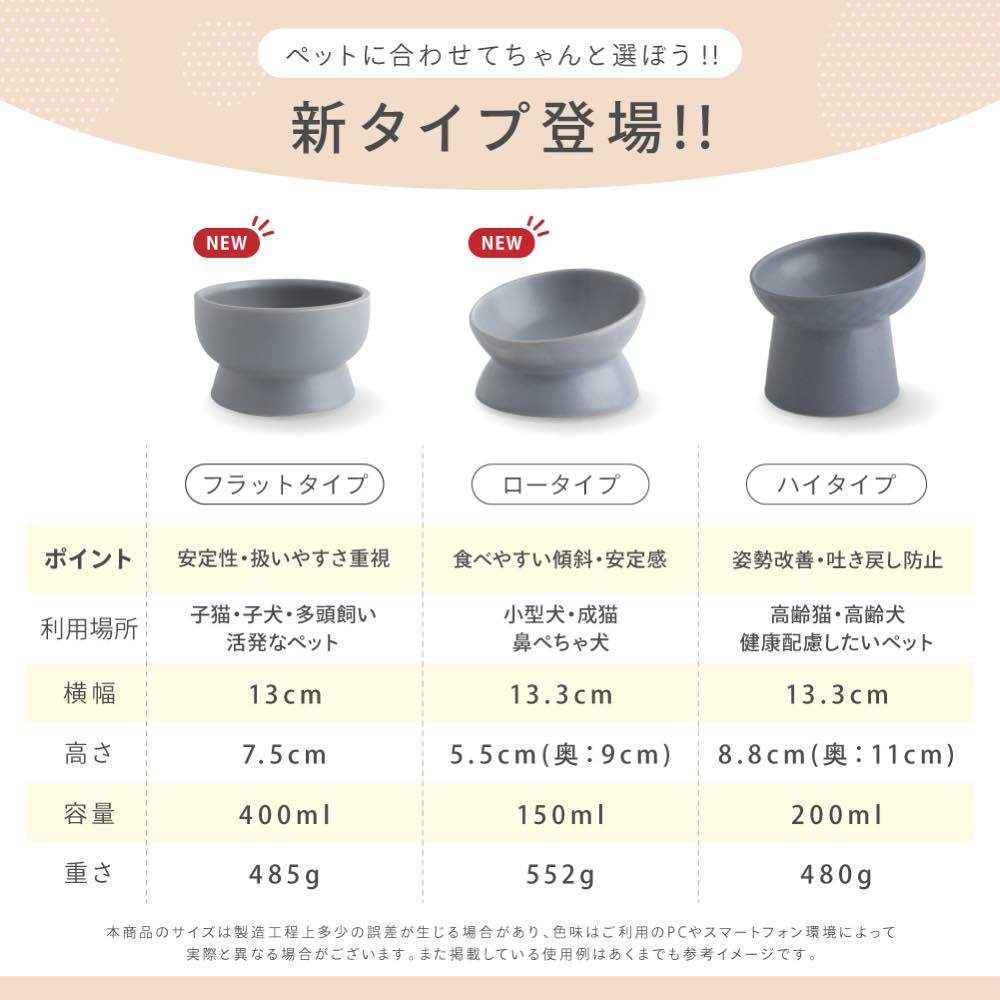 商品名 犬 食器 猫 フードボウル ペット ペットボウル 陶器 高さ 斜め ハイスタンド 餌皿 餌入れ 水入れ 餌 エサ皿 セラミック おしゃれ 小型犬 中型犬 犬用 猫用 傾斜 商品特徴 ハイスタンド設計で前屈みになりにくくペットの足腰への負担を軽減。 トレーは15°の傾斜がある形状なのでフードがまとまりやすくスムーズに食べられ胃への負担を軽減、吐き戻し予防にも。 熱や衝撃に強く耐久性抜群のセラミック素材を採用。滑らかな質感で滑りや汚れもつきにくく、お手入れ楽々。 軽量のプラスチック製と比較すると重厚感もしっかりしているので転倒しにくく安定感も抜群、安心してお食事タイムを過ごせます。 シンプルで高級感のあるデザインなのでインテリアにも馴染みやすく、おしゃれな空間を演出してくれます。 見た目も使い心地も抜群の陶器製ペットボウルです。 タイプ ハイタイプ/ロータイプ/フラットタイプ カラー ホワイト、ブラック、ピンク、グレー、ネイビー、イエロー サイズ ハイタイプ:高さ9〜11cm、直径13cm 480g ロータイプ:高さ5.5〜9cm、直径13cm 552g フラットタイプ:高さ7.5cm、直径13cm 485g 材質 セラミック 容量 200ml 材質 セラミック ご注意 お客様のPC環境やモニタ解像度や明暗の環境によっては実際の商品の色と相違がある場合がありますのでご了承ください。 製品の性質上黒い点や小傷が見られる場合がございますが、商品不良ではございませんので返品交換等のご対応はできかねます事あらかじめご了承ください。 梱包について 環境保護の為、簡易包装での出荷とさせて頂いております。 商品キーワード 猫用食器 犬用食器 高さがある 餌台 高い水飲み皿 犬のご飯 皿 猫のご飯用 ペットボール フードボール ペット用食器 えさ入れ 犬の餌皿 おしゃれ かわいい 送料無料