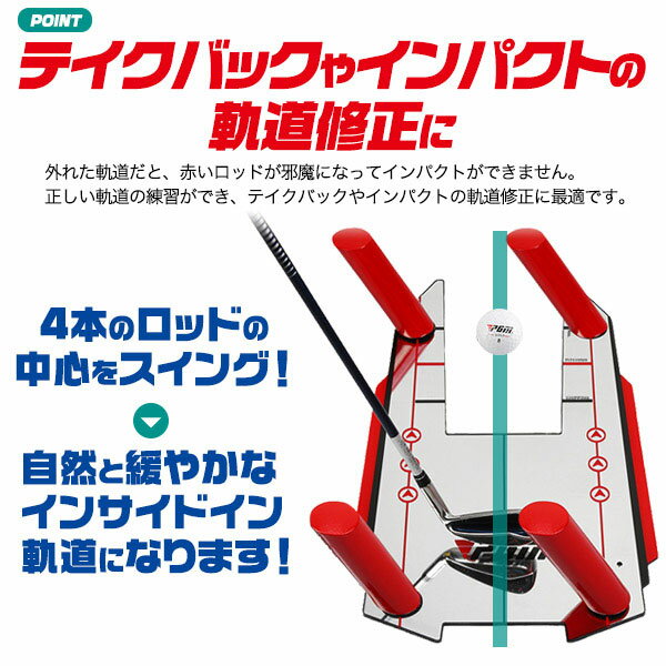 ゴルフ用品 スイングの軌道修正に アライメントスイングトレーナー スイングすると、テイクバック、インパクト、フォローの正しい軌道が確認でき、修正できるアライメントスイングトレーナー。外れた軌道だと、赤いロッドが邪魔になってインパクトができません。正しい軌道の練習ができ、テイクバックやインパクトの軌道修正に最適です。赤いロッドを位置を変えることで、スライスやフックの軌道練習が可能です。ロッドはクラブを傷つけない柔らかい素材を使用しています。ミラータイプなので、ロッドを外せばパッティングミラーとしても使用できます。ロッドは面ファスナー仕様なので、簡単に取り外し可能です。 サイズ(約):本体:縦51×横30.8cm ロッド:高さ14×直径4.2cm 重量(約):475g 付属品:収納袋ゴルフ用品 スイングの軌道修正に アライメントスイングトレーナー スイングすると、テイクバック、インパクト、フォローの正しい軌道が確認でき、修正できるアライメントスイングトレーナー。外れた軌道だと、赤いロッドが邪魔になってインパクトができません。正しい軌道の練習ができ、テイクバックやインパクトの軌道修正に最適です。赤いロッドを位置を変えることで、スライスやフックの軌道練習が可能です。ロッドはクラブを傷つけない柔らかい素材を使用しています。ミラータイプなので、ロッドを外せばパッティングミラーとしても使用できます。ロッドは面ファスナー仕様なので、簡単に取り外し可能です。 サイズ(約):本体:縦51×横30.8cm ロッド:高さ14×直径4.2cm 重量(約):475g 付属品:収納袋