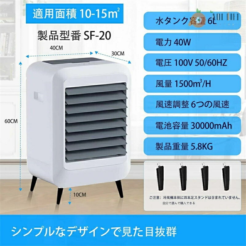 【4つモード 多機能】 この冷風機は、強力送風、 冷却加湿 、タイマー機能 、自動首振 4つモード。冷却ファンとして、自然な涼しい風を感じながら空気を加湿し、乾燥を防ぎ、加湿と冷却の効果が期待できます。この製品は、熱中症の予防にも非常に効果的です。すぐに涼しさを感じ、快適な夏を楽しむことができます。 【大容量リチウムイオン電池】 30000mAh 電池, このポータブルスポットクーラー,バッテリーを内蔵しています。最大約40W入力に対応し、約3.2時間の高速充電,を実現.。フル充電で、最低風速で最大24時間使用可能で、一日中使用できます。 【ブラシレスDCモーターまた】 先進のブラシレスDCモーター,高効率、静音、省エネ、長寿命,仕事、読書、睡眠中でも邪魔になりません。オフィスや寝室など、さまざまな場所に最適です。 【無段変速とタイマー】 ボタン操作で風量を調節し、タイマーを設定できます。弱、中、強の無段変速風力調整 、状況に応じて調整できます。タイマー設定可能で、設定時間が終了すると自動的にファンがオフになるため、就寝前に設定して安心して眠りにつくことができます。 【6L大容量水タンク】 6Lの大容量水タンクが装備されており、頻繁な給水の必要がありません。強力運転時の平均蒸発量は約2L/時間(環境によって異なります)、必要に応じて氷水を加えるとより冷たくなります。底部排水設計で、エアクーラー内の汚水を簡単に排出できます。6Lの視認可能な水位窓は、日常の冷却ニーズに応えます。 【自動首振り機能で用途広がる】 風量1500m?/H,左右自動首振り機能と上下首振り機能を備えており、冷却範囲を広げたり、空気を自由に循環させたりすることができます。この冷風機は、リビング、寝室、書斎、エントランス、会議室、カフェ、ホテル、キャンプ、テント、庭園、ビジネス、屋外など、さまざまな場所で使用できます。