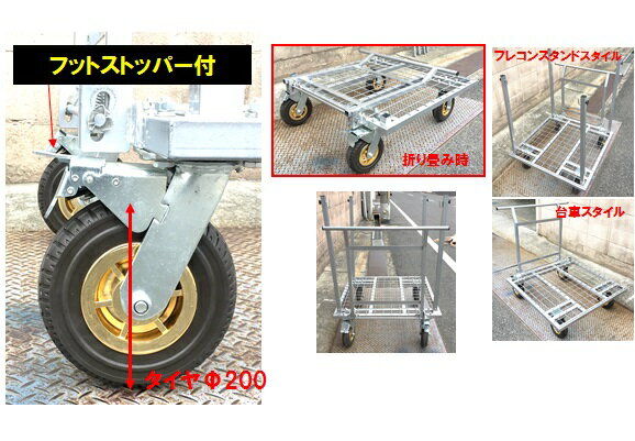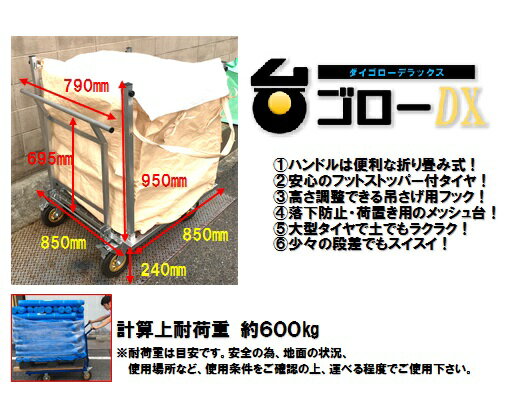 段差も砂利もガンガン進む 1台2役フレコン用台車&フレコンスタンド 【特長】 ハンドルは便利な折り畳み式! 安心のフットストッパー付タイヤ! 高さ調整できる吊さげ用フック! 落下防止・荷置き用のメッシュ台! 大型タイヤで土でもラクラク! 少々の段差でもスイスイ! 現場で産廃物や資材運搬、工場・倉庫内作業でお困りの人たちの声を集結して開発した特別仕様の台車です。 段差もパンクも気にしないφ200のタイヤ。停車時も安心の停止ストッパー付きφ200ノーパンクタイヤを採用。 土でも砂利でも路面でも気にせず進みます。また現場エレベーターに乗せたいとの声から試行錯誤の末、現在のDXは850角仕様に変更。 耐荷重はなんと約600kg!省スペース化の声もあったので積み重ねも可能にしています。 ハンドルを折り畳み、タイヤの向きを変えれば約5台までは積み重ねて保存できます。また、台ゴローDX専用のフタつき角型フレコンバックもあります。 【用途】 建設現場・建築現場等での産廃用台車 その他資材運搬用台車として使用できます。 品番 台ゴローDX(折り畳みハンドル) 品番 フレコンスタンド棒4本(重量計5kg) 材質 本体スチール製ノーパンクタイヤ4輪(内2輪ストッパー付き) 耐荷重 約600kg ※耐荷重は目安です。安全の為、地面の状況、使用場所など、使用条件をご確認の上、運べる程度でご使用下さい。 サイズ 本体:縦850×横850 タイヤφ200 重量 本体35kg(タイヤ付き) 付属の支柱4本 計5kg 色 シルバー