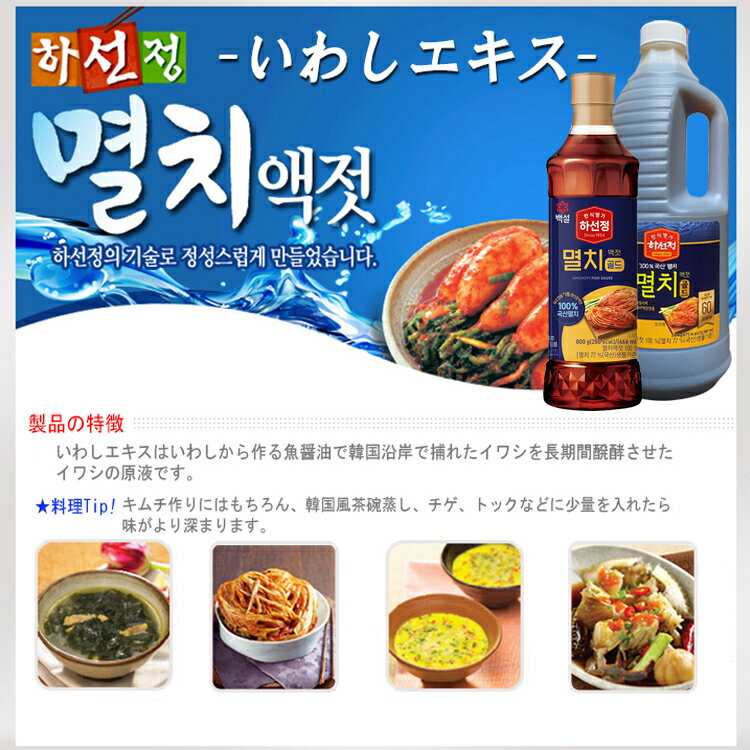 ※商品入荷によって商品パッケージが変わる場合がございます。 予めご了承ください。 商品説明 商品名 ハソンジョン イワシエキス 内容量 2.5kg(1本あたり 白菜ポギキムチ 50株作れる) 原材料名 いわしエキス100%(韓国産いわし77%)、食塩(原材料の一部にえびを含む) 保存方法 直射日光、高温多湿を避けて涼しい場所に保存して下さい。 生産国 韓国 備考 韓国産イワシ100%だけを1年間発酵させて製造した自然食品です。 料理の本来のうま味を自然に引き出すイワシの魚醤油です。キムチを漬けるときに欠かせない必需品です。キムチ以外にも様々な料理に塩、醤油、調味料の代わりに使ってみてください。ハソンジョン イワシエキス 2.5kg