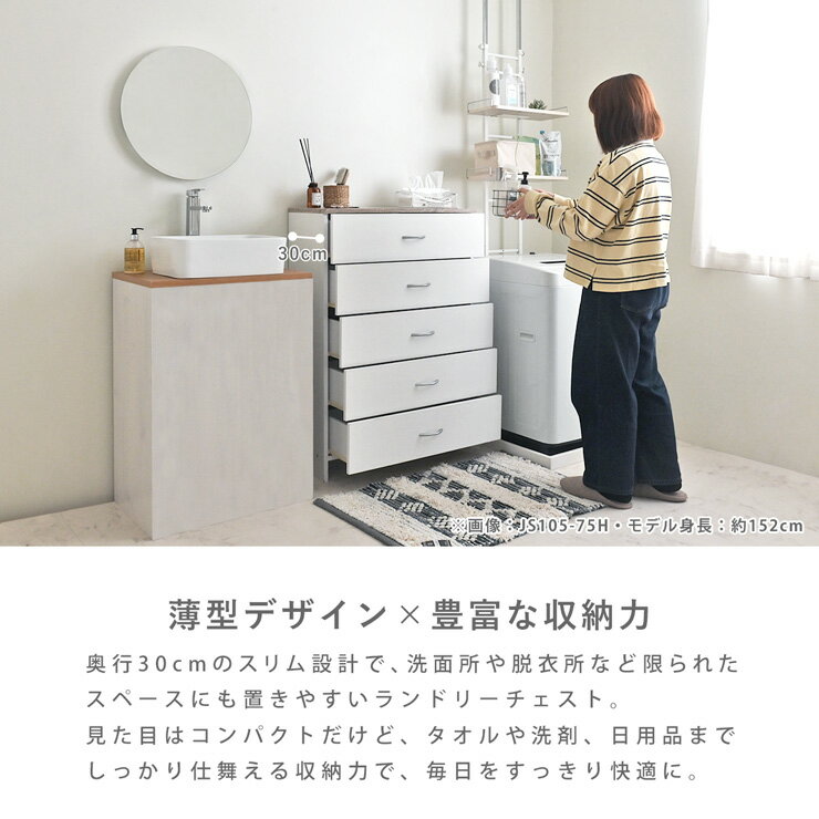 隙間に合わせて選べる6種類のランドリーチェスト。 奥行30cmでも大容量収納!デッドスペースを活かして快適なランドリースペースに。 商品名:ランドリーチェスト ロータイプ / ハイタイプ JS105-45H・JS105-60H・JS105-75H / JS180-45H・JS180-60H・JS180-75H この商品の仲間 ランドリー収納 落ち着いた木目調の天板がおしゃれなすき間収納。ランドリーや洗面台などちょっとしたスペースに。 ランドリーなどのすき間にすっきりと収納できるランドリー収納です。省スペースでも設置できるコンパクトサイズで、タオルやヘアアイロン、ボトル類などをしっかり収納できます。天板と前板には、水や汚れに強いPVC加工を施しており、サッと拭き取るだけでいつでも清潔にお使いいただけます。豊富なサイズ展開で、使う場所や収納量に合わせてぴったりの一台をお選びいただけ、シンプルで落ち着いたデザインは、ランドリーはもちろん、キッチンやリビングなど、幅広い場面で活躍します。 商品名 ランドリーチェスト ロータイプ / ハイタイプ サイズ 【ロータイプ 幅45cm / 60cm / 75cm】 本体サイズ:W45 / 60 / 75×D30×H105(cm) 引出し内寸:W36.3 / 51.3 / 66.3×D25.4×H12.6(cm) 脚元空間高さ:8cm 【ハイタイプ 幅45cm / 60cm / 75cm】 本体サイズ:W45 / 60 / 75×D30×H180(cm) 扉内内寸:W41.2 / 56.2 / 71.2×D26.9×H34.6(cm) オープン部内寸:W41.2 / 56.2 / 71.2×D28.6×H37(cm) 引出し内寸:W36.3 / 51.3 / 66.3×D25.4×H12.6(cm) 脚元空間高さ:8cm 材質 【ロータイプ】 本体:プリント紙化粧繊維板 天板、引出し前板:合成樹脂化粧繊維板 【ハイタイプ】 本体:プリント紙化粧繊維板 中天板、前板(扉/引出し):合成樹脂化粧繊維板 商品重量 【ロータイプ 幅45cm】20kg 【ロータイプ 幅60cm】23.6kg 【ロータイプ 幅75cm】27.1kg 【ハイタイプ 幅45cm】29.2kg 【ハイタイプ 幅60cm】34.6kg 【ハイタイプ 幅75cm】39.6kg 耐荷重 【ロータイプ 幅45cm】天板:約8kg、引き出し:約5kg 【ロータイプ 幅60cm】天板:約10kg、引き出し:約5kg 【ロータイプ 幅75cm】天板:約10kg、引き出し:約5kg 【ハイタイプ 幅45cm】天板:約8kg、中板:約6kg、移動棚:約5kg、引き出し:約5kg 【ハイタイプ 幅60cm】天板:約10kg、中板:約7kg、移動棚:約7kg、引き出し:約5kg 【ハイタイプ 幅75cm】天板:約10kg、中板:約7kg、移動棚:約7kg、引き出し:約5kg 梱包サイズ 【ロータイプ】幅45cm:W110×D34.5×H18(cm) 【ロータイプ】幅60cm:W111×D35×H22.5(cm) 【ロータイプ】幅75cm:W111×D42.5×H18.5(cm) 【ハイタイプ】幅45cm:W111×D34.5×H25(cm) 【ハイタイプ】幅60cm:W114×D36.5×H32(cm) 【ハイタイプ】幅75cm(2梱包):W110×D42.5×H14、W83×D42×H21(cm) 梱包重量 【ロータイプ】幅45cm:約21.9kg 【ロータイプ】幅60cm:約25.7kg 【ロータイプ】幅75cm:約29.3kg 【ハイタイプ】幅45cm:約31.8kg 【ハイタイプ】幅60cm:約37.7kg 【ハイタイプ】幅75cm(2梱包):約21.9kg、約21.5kg 備考 お客様組立商品 【ロータイプ】 組み立て時間目安:2人/約90分 【ハイタイプ】 組み立て時間目安:2人/約120分 移動棚:2枚 関連商品 ランドリー収納一覧はこちら スタッフコメント 落ち着いた木目調の天板がおしゃれなすき間収納。ランドリーや洗面台などちょっとしたスペースに。ランドリーなどのすき間にすっきりと収納できるランドリー収納です。省スペースでも設置できるコンパクトサイズで、タオルやヘアアイロン、ボトル類などをしっかり収納できます。天板と前板には、水や汚れに強いPVC加工を施しており、サッと拭き取るだけでいつでも清潔にお使いいただけます。豊富なサイズ展開で、使う場所や収納量に合わせてぴったりの一台をお選びいただけ、シンプルで落ち着いたデザインは、ランドリーはもちろん、キッチンやリビングなど、幅広い場面で活躍します。 色合いについて 実物の商品になるべく近いお色になるよう配慮しておりますが、お客様のご使用のモニターやブラウザなどの環境により、実物と異なる場合がございます。個体差による返品・交換は予めご了承ください。 お荷物のお渡しについて 佐川急便での配送で「玄関先でのお渡し」となっております。通常のお荷物のお届けと同様のお渡しとなります。