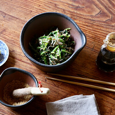 商品名 萬古焼 櫛目のないすり鉢 M サイズ 160×155×70mm 容量:670ml 素材 陶器 ブランド 日常茶飯器 生産国 日本櫛目のない万能すり鉢 あえて内側の溝を無くした、優しい風合いが魅力の萬古焼すり鉢です。具材の詰まりがなくお手入れ簡単なのはもちろん、そのまま和えて器としても様になる佇まい。サイズ違いで重ねると入れ子になるのでスマートに収納出来るのも嬉しいポイントです。極上のすり鉢が私たちの暮らしをほんの少し豊かにしてくれるかもしれません。 1.溝がないのにしっかり擂れる ゴマや食材を擂るときに便利なすり鉢。ただ、溝に詰まった食材をとるのは一苦労しますよね。そんなお悩みを解決してくれる"櫛目がない"不思議な片口すり鉢です。 粗土の特性と釉薬の吹きつけに工夫を施し内側をザラザラとした質感に。細かい凹凸を利用することで食材をなめらかにすり潰すことが出来ます。機能美あふれるデザインでお手入れが簡単なのも嬉しいポイント。 2.安定感抜群の幅広フォルム 土台に重心を置いた横広のすり鉢は力強くつぶしても滑らず安定感抜群。両手ですりこぎを持って、しっかり擂ることが出来ます。 そのまま和えられる広さと切り立ったデザインが具材のこぼれを防止。また、片口付きでとろろやドレッシングなどの液体が注ぎやすいのも嬉しいですね。 細部まで使い手に寄り添った絶妙なカタチに仕上げられています。 3.日本の伝統工芸"萬古焼" 300年以上の歴史があり、鉱石を含んだ特別な陶土で作られた器は耐久性が非常に高く丈夫なつくり。それでいて陶器ならではの優しい質感も持ち合わせ、手に取る人の心を和ませてくれるよう。 作り手の想いや技を丁寧に伝える 焼き物文化が根付いた土地から生まれたブランド"日常茶飯器"は、何気なく繰り返される「食」を心を豊かにする「しぐさ」にしたい。そんな志から、ごく自然に手に取って使える「使い勝手の良いもの」を生み出し続けています。 ひとつひとつ手ひねりで作られたすり鉢はそれぞれ微妙に表情が異なります。同じモノは一つもない手作業の風合いと陶器ならではの特性をお楽しみください。 4.用途に合わせて選べる3サイズ こちらはMサイズの商品ページです。 3種類のサイズ展開で用途に合わせて選んでいただけます。 Mサイズはすり鉢としてはもちろん、器としても使いやすい大きさ。入れ子式でサイズ違いで重ねた時の収まりさえ美しく、収納場所を取らないのも使い勝手が良いポイントです。 パンダ食堂監修の特別カラー 人気のMサイズは2色展開。ほんのり灰がかった優しいくすみ色と素焼きの風合いが相性ばっちり。テーブル上でアクセントとなり明るい食卓を演出します。 サイズに合う「すりこぎ棒」あります 野趣あふれる山椒のすりこぎは素朴な陶器との相性ばっちり。非常に硬く丈夫なつくりで食材を擂るのがより一層楽しくなりますよ。 5.すって混ぜて、そのまま食卓へ 溝がないので鉢の中で和えやすく、器代わりにそのままテーブルへ。シンプルなデザインと釉薬の優しい風合いが温かみあふれる空間を演出してくれます。洗い物も減り、慌ただしい食卓でも大活躍ですね。 調理道具から器まで幅広くお使いいただけ、暮らしに寄り添う優しい道具。新生活のスタートや大切な方への贈り物にもきっと喜ばれます。 TOKILABOでは心をこめてラッピングいたします。 購入前の確認事項 ●商品の特性について 白はパンダ食堂監修のレシピが付属しています。また黒に比べて素焼きの範囲が多くデザインが異なります。 陶土に含まれる粒子や鉄分の割合によって仕上がりの色合いには個体差が見られます。 これらは良品の範囲となりますのであらかじめご了承ください。 すり鉢を使う際は下にかたく絞った布巾を敷くのがおすすめです。 強い衝撃や急激な温度変化を避け、ひび・かけが発生した場合は使用をやめてください。 多少の吸水性があります。使用後は手早く洗い、よく乾かしてから収納してください。 研磨剤入りたわし・クレンザー・金属たわし等は使用できません。 釉薬によっては貫入(表面の細かいひび)の入るものがありますが仕様上の支障はございません。 電子レンジ・食器洗い乾燥機の使用は可能です。 直火・オーブンの使用はできません。 商品詳細 カラーバリエーション (左から):薄灰、黒 サイズバリエーション (左から):S、M、L こちらの商品は【M】です。 全体の形状と重量 サイズ:160×155×70mm 容量:670ml