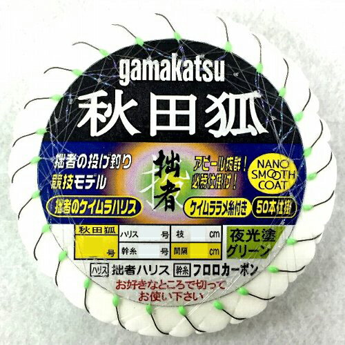 抜群の鈎刺さり、フッ素加工の秋田狐。 拙者のケイムラハリス、ケイムララメ糸、夜光グリーン塗り、ナノスムースが威力を発揮!!こだわりの50連結仕掛。 ●2.5号-5号までラインナップ。 ●ハリスは拙者のケイムラハリスを使用。 ●ケイムララメ糸2本を逆付け。 ●幹糸は潮なじみが良く、沈降が早いフロロカーボンを使用。 ●チモトには蓄光タイプの夜光グリーン塗り ●がまかつG杯使用可能。 【ケイムラについて】 海の水深が深くなればなるほど太陽光は届きにくくなります。太陽光の中で一番深いところまで届きやすいのは紫外線です。ケイムラはその紫外線に当たると青色発光し、アピール抜群です。 【魚の色覚は、人間よりはるかに優れています】 人は紫外線を見る事はできませんが、魚には紫外線が見えます。水中では可視光線は届きにくくなりますが、紫外線は比較的深いところまでも届きます。その紫外線に反応し、青色発光している色が魚には見えます。 【ケイムラの色について】 通常の光では見えません。 ブラックライト(UVライト)等で強い紫外線を当てると青色発光するのが見えます。 鈎 鈎号数 チモト 塗り ラメ糸 幹糸 素材 幹糸 号数 ハリス 素材 ハリス 号数 エダス 長さ エダス 間隔 秋田狐 ナノスムース 2.5号 夜光 グリーン ケイムラ ラメ糸 フロロ カーボン 1.25号 拙者の ケイムラ ハリス 0.6号 3cm 25cm 3号 1.5号 0.6号 3cm 25cm 3.5号 1.5号 0.6号 3.5cm 27cm 4号 1.75号 0.8号 3.5cm 28cm 5号 1.75号 0.8号 4cm 30cm