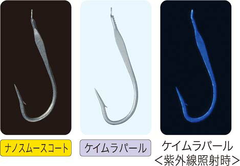 鈎がシロギスに強烈アピール!! 軸部の加工により手返し抜群の「手返しキス」に“ケイムラパールカラー”が登場。 輝く「パールホワイト」にケイムラコートをプラス、紫外線に反応し妖しくキスを誘います。 1分1秒を競うトーナメンターに最速の手返しを「チモト部に軸打ち」加工を施すことにより、鈎がつまみやすくなりました。 エサ付け、鈎はずしが容易になり、最速の手返しを実現します。鈎先をわずかに外向きに設定することによりコンタクト性能を高め、吐き出されることなく口元で鈎掛かりさせます。 【ケイムラについて】 海の水深が深くなればなるほど太陽光は届きにくくなります。太陽光の中で一番深いところまで届きやすいのは紫外線です。ケイムラはその紫外線に当たると青色発光し、アピール抜群です。 【魚の色覚は、人間よりはるかに優れています】 人は紫外線を見る事はできませんが、魚には紫外線が見えます。水中では可視光線は届きにくくなりますが、紫外線は比較的深いところまでも届きます。その紫外線に反応し、青色発光している色が魚には見えます。 【ケイムラの色について】 通常の光では見えません。 ブラックライト(UVライト)等で強い紫外線を当てると青色発光するのが見えます。※写真はデザインイメージです。