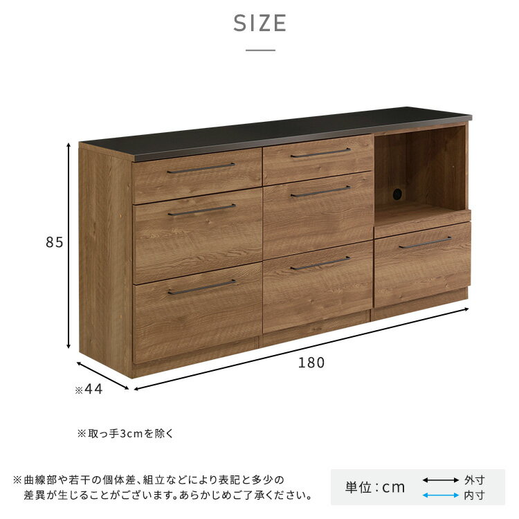 【素材】天板:特殊鋼板本体:プリント紙化粧繊維板取っ手:スチール【商品サイズ】(約)W180×D44×H85cm【商品重量】(約)82kg【梱包サイズ】天板:(約)W185×D47.5×H6.5cm本体(1梱包当たり):(約)W63×D48×H84cm【梱包重量】天板:(約)13kgオープン収納:(約)23kg引き出し収納(2梱包):(約)30kg【生産国】日本【カラー】2色(WAL,NA)【耐荷重】天板:(約)40kg【オープン収納】スライド棚:5kg引き出し:8kg【引き出し収納】引き出し(上段):5kg引き出し(中・下段):8kg【その他】本体と天板は別梱包です。本体は3梱包でのお届けです。天板は幅180cmとなっておりますので、3台並べてお取り付けください。
