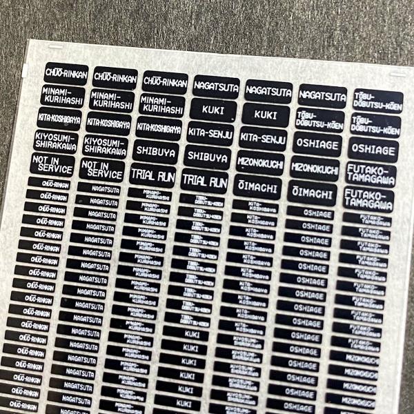 Nゲージ(1/150スケール)用の方向幕インレタ。 品番376 8500系方向幕インレタ(1)をそのまま英語標記にしたものです。 実車は日英交互に表示されるので、お持ちの模型でも車両交互に貼るなど色々楽しむのも良いかもしれません。 「(1)」「(2)」には裏返すと裏貼りの(K)マークが収録されています。2色刷りのインレタです。必ずノンアルコールのウェットティッシュ等を用いて表面の脂を落としてから転写し、裏紙をあててしっかり密着させ、クリアコーティングしてください。