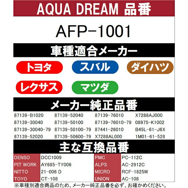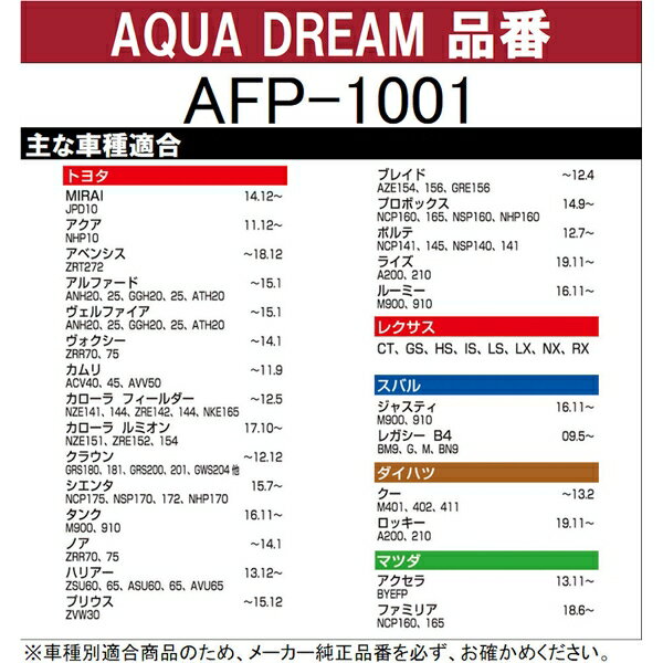 <納期コメント>記載されております納期は在庫有り時の目安となります。万が一欠品や完売、納品まで長期の日数がかかる、または納期が未定などの場合は速やかにご連絡をさせていただきますので、予めご了承頂きます様お願いいたします。<商品概要>■確実な濾過機能(高除塵、高脱臭、除菌、抗菌、安定風量)で車内の空気を常に快適に保つエアコンフィルターです!■AQUA DREAM PLATINUM エアコンフィルターは純正三層構造と濾紙面積を基準に高精度な設計品質により、大気中から車内に侵入する有害物質PM2.5、花粉、排ガス粉の集塵及び車室内に循環する排ガス、タバコ等嫌な臭いも活性炭層が吸収することで車内空間を快適に保ちます。■粒子捕捉可能範囲 0.1〜100(μm)粒子径により除去率は変わります。PM2.5微粒子 ・排ガス微粒子 ・花粉 ・浮遊菌 ・アレル物質【三層構造フィルターの機能と4つの力】■高除塵(特殊静電不織布)車外から侵入する異物を高性能ろ紙で捕捉します。有効な物質・・・ゴミ粉塵、花粉、排ガス粒子、ペットの毛、カビ粒子、ダニの死骸■脱臭効果(100%ヤシ殻活性炭粒子ろ紙織り込み)高品質活性炭が不快な臭いを吸収します。有効な臭い・・・タバコ臭、アンモニア臭、衣類付着臭、ペット臭、排ガス臭■抗菌/防カビ(Ag銀イコンコートろ紙)銀イオンがフィルターに付着した菌・カビの活性化を抑制。健康な空気循環を保ちます。有効作用・・・ウイルス、菌、カビ■安定風量(エアコンの風量を新車時にキープ)高精度ろ材を採用し、除塵層、脱臭層、抗菌層を通過する空気の抵抗を低くすることで清浄効果と空気量を確保■エアコンフィルターの交換時期の目安は、1年もしくは走行約10000kmごとです。エアコンを季節始めに使い始めて異臭がする、カビ臭いと感じる前に、エアコンフィルターの交換で常に車内空間をフレッシュな空間にしておきましょう。(上記は一般的な交換目安となります。実際の交換はお車の取り扱い説明書のマニュアルのご確認をお願いいたします)【エアコンフィルターの交換について】・グローボックスの奥や運転席の足元に取付けしているエアコンフィルターの部分を交換する車輛に携帯する取扱説明書に従い、正しく交換してください。※エアコンフィルター装着後必ずエアコンを作動し風量に異常が無いことを確認してください。■【使用上の注意】※ご購入の際には必ず、純正代表品番よりか、若しくは商品のサブ画像「車種別 総合適用表」などの適合情報をご確認ください。尚、同じ車種でも年式・型式によりましては適合しない場合がございます。※交換作業は必ずエンジン及びエアコンを止めてから行ってください。※フィルターの適合車種選択はパッケージに記載する車種または弊社適合表よりお選びください。※本製品は使用時の脱臭効果を保つため密封しております。開封される場合フィルターを傷つけない様、開封してください。※交換方法はパッケージに封入しています、取付説明書を参考に交換して下さい。※フィルターを取付する場合表側と裏側を確認し正しく取付してください。本品は車輛エアコン以外には使用しないでください。※フィルター交換後はエアコンを作動し風量に異常がないことを確認して下さい。※交換後の古いフィルターはエアーブロー及び水洗による再使用はできません。不燃ごみとして処理して下さい。※使用環境(粉塵の多い寒冷地、舗装の無い道路等)走行ではフィルター交換を早めにして下さい。また走行時の周囲状況、(化学工場、臭気を連続的に放出する環境下)では臭気を遮断出来ないこともあります。※活性炭(ヤシ殻)性質上吸着した臭気を個体より放出するため、一時的に臭いを感じる場合がありますが、エアコンを循環することにより消えます。<商品仕様>●品番:AD-AFP-1001●適合メーカー:トヨタ(レクサス) ・ スバル ・ ダイハツ●純正共通品番:87139-B1020 ・ 87139-30040 ・ 87139-30040-79 ・ 87139-52020 ・ 87139-52040 ・ 87139-50100 ・ 87139-50100-79 ・ 87139-50600-79 ・ 87139-76010 ・ 87139-76010-79 ・ 87441-26010 ・ X7288AL000 ・ X7288AJ000 ・ 08975-K1002 ・ B45L-61-J6X ・ 1M01-61-528●互換品番:【DENSO】DCC1009 ・ 【PMC】PC-112C ・ 【PIT WORK】AY685-TY006 ・ 【ALPS】AC-2912C ・ 【NITTO】21-006D ・ 【MICRO】RCF-1825W ・ 【TOYO】CT-108 ・ 【UNION】AC-108主な適合車種・型式・年式【トヨタ】●MIRAI:JPD10(2014.12〜)●アクア:NHP10(2011.12〜)●アベンシス:2RT272(〜2018.12)●アルファード:ANH20/25/GGH20/25/ATH20(〜2015.01)●ヴェルファイア:ANH20/25/GGH20/25/ATH20(〜2015.01)●ヴォクシー:ZRR70/75(〜2014.01)●カムリ:ACV40/45/AVV50(〜2011.09)●カローラフィルダー:NZE141/144/ZRE142/144/NKE165(〜2012.05)●カローラルミオン:NZE151/ZRE152/154(2017.10〜)●クラウン:GRS180/181/GRS200/201/GSW204他(〜2012.12)●シエンタ:NCP175/NSP170/172/NHP170(2015.07〜)●タンク:M900/910(2016.11〜)●ノア:ZRR70/75(〜2014.01)●ハリアー:ZSU60/65/ASU60/65/AVU65(2013.12〜)●プリウス:ZVW30(〜2015.12)●ブレイド:AZE154/156/GRE156(〜2012.04)●プロボックス:NCP160/165/NSP160/NHP160(2014.09〜)●ポルテ:NCP141/145/NS