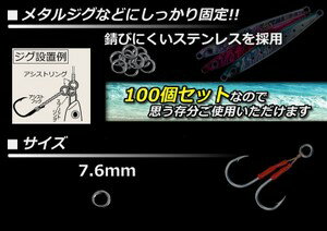 ★送料無料(メール便にて発送致します) (郵便ポストへの投函となります。到着日や時間指定は出来ません) メタルジグなどにしっかり固定!! 錆びにくいステンレスを採用しているので安心♪ 100個セットなので 思う存分ご使用いただけます!! サイズMサイズ7.6mm 素材ステンレス 製造中国 ※仕様・デザイン等は予告なく変更することがございます。【送料無料】メール便での発送予定となります