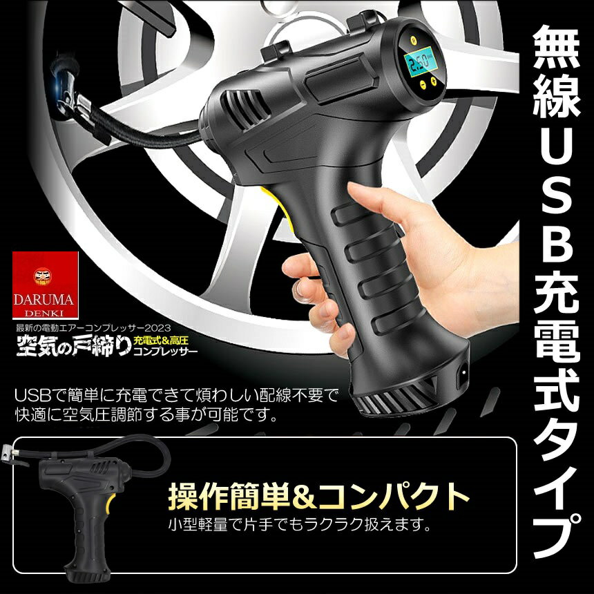 デジタルLCDスクリーン ディスプレイスクリーンを使用して タイヤの空気圧をタイヤに必要なものにプリセットできます。 無線USB充電式タイプ USBで簡単に充電できて煩わしい配線不要で 快適に空気圧調節する事が可能です。 操作簡単&コンパクト 小型軽量で片手でもラクラク扱えます。 空気圧調整、自動停止 「SET」ボタンを押してLCDデジタル表示します。 設定したタイヤ空気圧に達すると自動で停止します。 LEDライト付き LEDライトで手元を明るく照らせ安全にバルブの開け閉めや 空気入れの時も便利です ※説明書は付属しておりません。※アタッチメントやデザインは若干異なる場合がございます