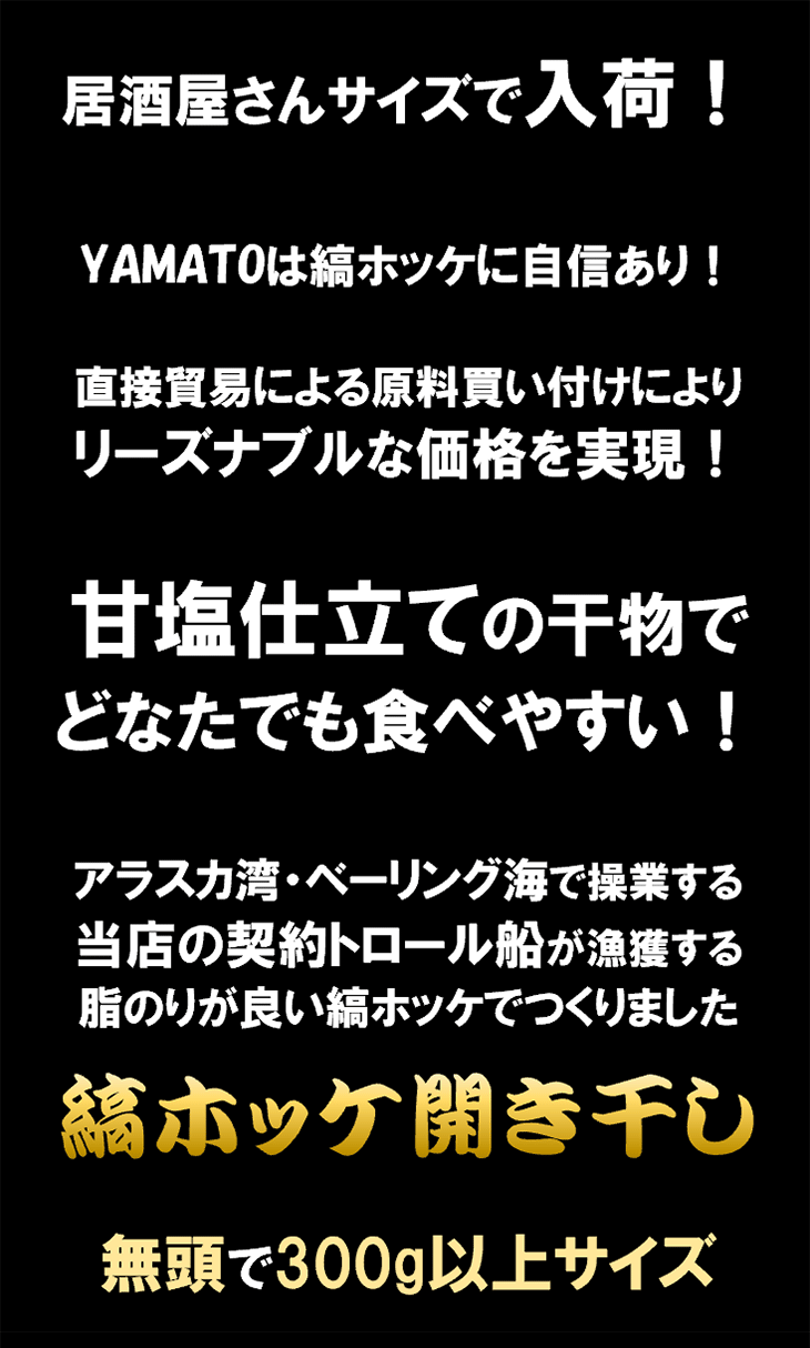 商品名 縞ホッケの開き干し 原料原産地:アメリカ 原材料名:縞ホッケ、食塩、/ 酸化防止剤(V.C) 保存方法:-18℃以下で保存 内容量:1枚 賞味期限:商品に業務用冷凍庫保管での賞味期限が記載されますが、ご家庭用冷凍庫での保管は1ヶ月を推奨しております。 冷蔵:解凍当日 ※賞味期限に関してのご注意 各商品のパッケージには個別の賞味期限が記載されております。 この賞味期限は、業務用冷凍庫内-18℃以下の保存状況を条件としております。 ご家庭の冷蔵庫では-18℃以下を維持する事が難しいため、当店では商品の推奨期間として、当店出荷日より1ヶ月を推奨させていただいております。 栄養成分表示(100g当たり) ・熱量:176kcal ・たんぱく質:20.6g ・脂質:9.4g ・炭水化物:0.1g ・食塩相当量:1.8g ※この表示値は目安です。 加熱調理の必要性 加熱してお召し上がりください 送料 1,250円 ※送料無料商品と同梱で送料無料 ※沖縄県配送追加1,000円 配送方法 クロネコヤマト便または佐川急便(※配送業者は選択できません)(クール冷凍配送) 配送日時指定がある場合は、注文の際にお申し付け下さい。 ※天候、事故、在庫の都合で指定日時の商品到着ができない場合もございますが、その際は御了承下さい。 配送予定 順次発送予定 同梱について 冷凍商品と同梱が可能です 販売者 株式会社YAMATO 住所:宮城県塩釜市新浜町3-13-14