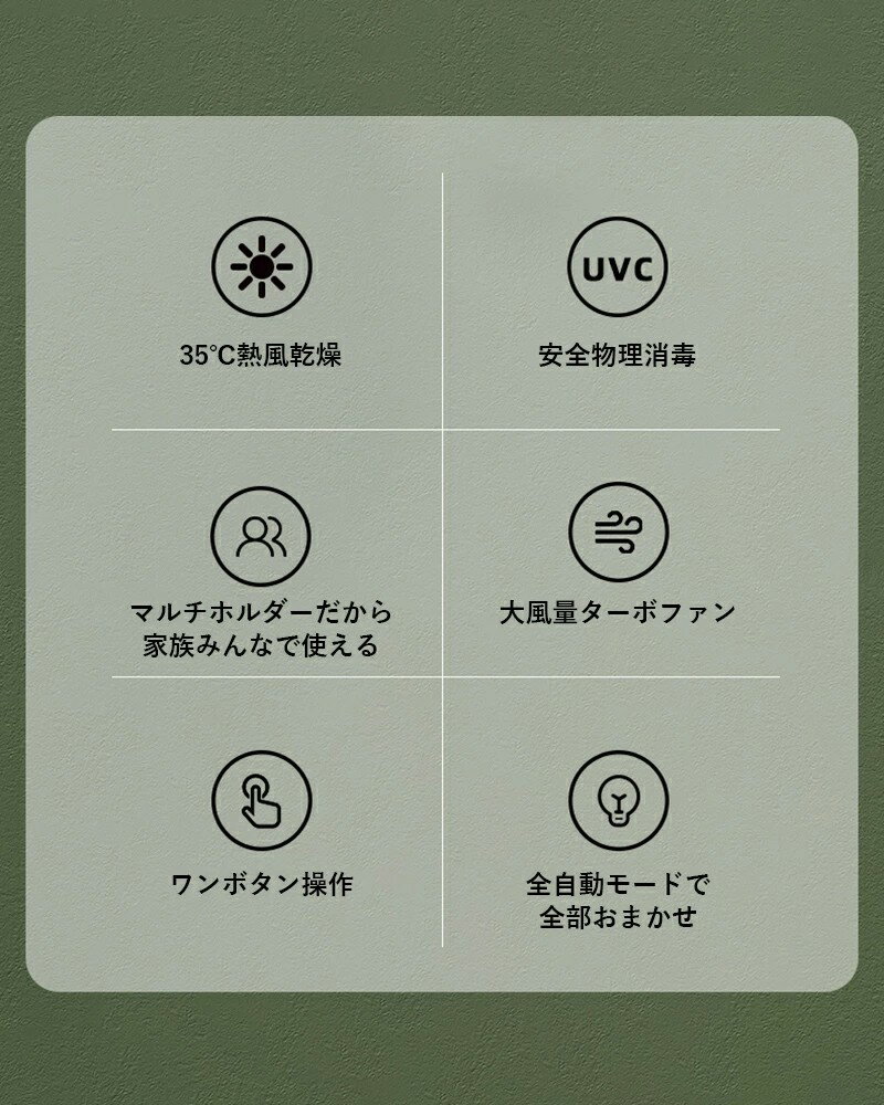【UV殺菌+大型収納】 99.99%除菌。歯ブラシ5本+カミソリ収納で家族全員分を収納できます。電動歯ブラシにも対応。省スペースで手狭な洗面所にもおすすめです。 【乾燥ファン付き+接触感染防止】 歯ブラシを濡れた状態で保管していると、歯ブラシ内での細菌増殖や、洗面台、浴槽、トイレなどの空気中細菌や水質菌による汚染リスクが高まります。歯ブラシ除菌器は乾燥ファン付きで、細菌の繁殖をしっかり抑え、二次汚染を予防します。歯ブラシ取り付け部分は取り外し可能で容易に洗浄できます。歯ブラシの個別ホルダーで、歯ブラシ接触による細菌汚染を防ぎますので衛生的で安心です。 【USB充電で超便利】 省エネでお財布に優しいUSB充電式です。4000mAhの大容量バッテリーを搭載、フル充電「モード1・毎日2回」で30日間使用できます。歯ブラシ除菌ホルダーにより歯ブラシの寿命を延長できるため、歯ブラシの買い替え費用も抑えられます。メーカー希望小売価格はメーカーサイトに基づいて掲載しています