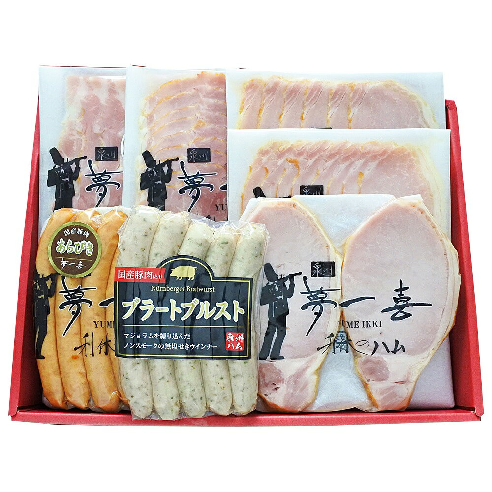 大阪 「夢一喜」 熟成ハム・ウインナー詰合せ 1980052 味付けには、ドイツのスパイスをオリジナルブレンド。肉の旨みを左右する塩は、ドイツのミネラル分豊富な岩塩を使用。約12日間かけてじっくり熟成させたハムは、風味が良く、肉本来の旨みが引き出されています。ウインナーは、ジューシーでパリッとした食感が特徴です。 ■商品詳細:ロースハムステーキ150g、ロースハムスライス79g×2、ボンレスハムスライス80g、ベーコンスライス80g、あらびきウインナー130g、ブラートブルスト120g ■ブランド名:夢一喜 ■製造生産地:大阪府 ■アレルゲン:豚肉 ■箱サイズ:25×17×9cm ■重さ:1kg ■賞味期間:冷蔵20日 ご注文の前に ※メーカー都合によりラベルデザイン・仕様(量目等)変更する場合がございます。※メーカー直送の為、配送方法の指定が不可となります。ご注文後、配送方法が変更になる場合もございますので、予めご了承の程よろしくお願いいたします。※当店からご注文内容についてご連絡を行う場合がございます。必ずメールやお電話のご確認をお願いいたします。●さまざまなギフトアイテムをご用意しております。 各種御祝い、内祝いギフト カタログ カタログギフト 贈り物 御礼 内祝い 今治タオル おしゃれ 御祝 内祝 出産内祝い お祝い 御祝い お礼 謝礼 御返し お返し 結婚内祝い 快気祝 退院祝い 快気内祝 開店祝い 御中元 お中元 お歳暮 お年賀 プレゼント 母の日 父の日 敬老の日 クリスマス 暑中御見舞 残暑御見舞 御見舞 御歳暮 御年賀 寒中御見舞 合格祝い 開院祝い 進学内祝い 御成人御祝 新年会 卒業記念品 卒業祝い ギフトカタログ グルメカタログ グルメギフト セット 詰合せ 詰め合わせ 御卒業御祝 成人式 入学祝い 入学内祝い 就職祝い 入園内祝い 御入園御祝 金婚式御祝 銀婚式御祝 御結婚お祝い ご結婚御祝い 御開店祝 御結婚御祝 結婚祝い 法事引出物 結婚式 引き出物 景品 お祝い返し バレンタイン 引出物 贈答品 粗品 引き菓子 御出産御祝 ご出産御祝い 出産御祝 出産祝い 御新築祝 新築御祝 新築内祝い 祝御新築 祝御誕生日 誕生日祝 七五三御祝 ひなまつり ホワイトデー 初節句御祝 節句 昇進祝い 昇格祝い 就任 お供え物 香典返し 志 粗供養 一周忌 三回忌 七回忌 十三回忌 十七回忌 二十三回忌 二十七回忌 御供 手土産 寸志 御仏前 御佛前 御霊前 進物 粗供養 偲草 偲び草 四十九日 七七日 忌明け 法要 仏事 法事引き出物 法事 年回忌法要 開店祝 開店御祝い 開店お祝い 御開業祝 周年記念 来客 お茶請け 御茶請け 異動 転勤 定年 退職 お餞別 粗菓 菓子折り 新歓 歓迎会 送迎会 忘年会 二次会 記念品 福袋 御見舞御礼 快気祝い 快気内祝い お土産 プチギフト 全快祝い 御挨拶 ごあいさつ 引越し バレンタインデー ご挨拶 引っ越し お宮参り 御年始 初盆 お盆 お彼岸 残暑見舞い 寒中お見舞 金婚式 銀婚式 ダイヤモンド婚式 長寿祝い 還暦祝 古稀祝い 喜寿祝い 傘寿祝い 米寿祝い 卒寿祝い 白寿祝い のし無料 ラッピング無料 メッセージカード無料 大量注文賜ります