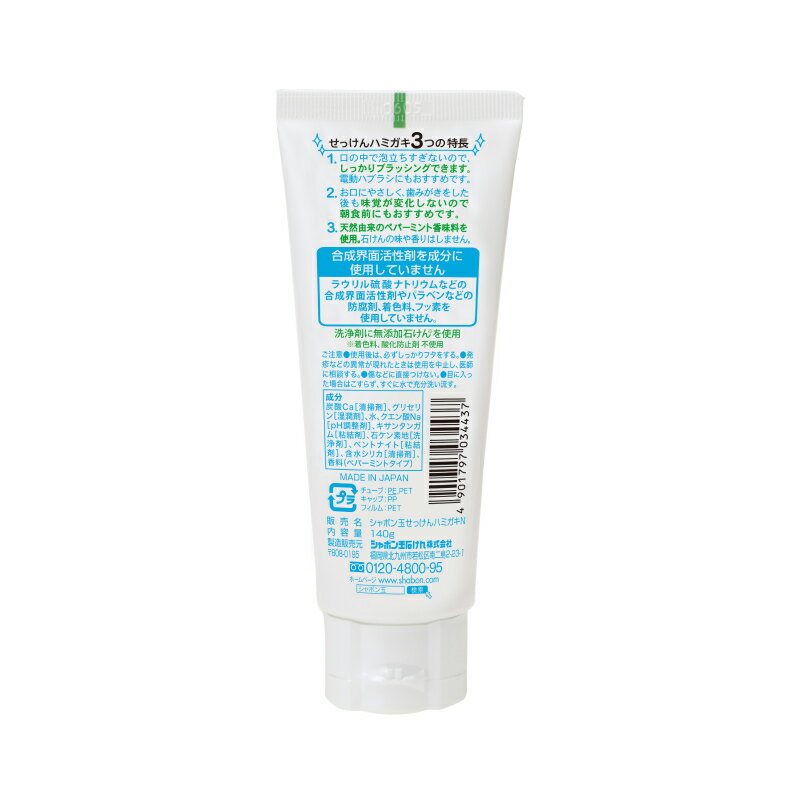 \2024年9月2日『せっけんハミガキシリーズ』リニューアル/ チューブから出しやすく、口当たりなめらかになりました! 口の中で泡立ちすぎないので、しっかりブラッシングできます。電動ハブラシにもおすすめです。 またお口にやさしく、歯みがきをした後も味覚が変化しないので朝食前にもおすすめです。天然のペパーミント香味料を使用。 洗浄剤に石けん成分のみの無添加石けんを使用しています。 ※着色料・酸化防止剤・合成界面活性剤不使用。 容量 : 140g 成分 : 炭酸Ca[清掃剤]、グリセリン[湿潤剤]、水、クエン酸Na[pH調整剤]、キサンタンガム[粘結剤]、石ケン素地[洗浄剤]、ベントナイト[粘結剤]、含水シリカ[清掃剤]、香料(ペパーミントタイプ) 商品コード : 2855