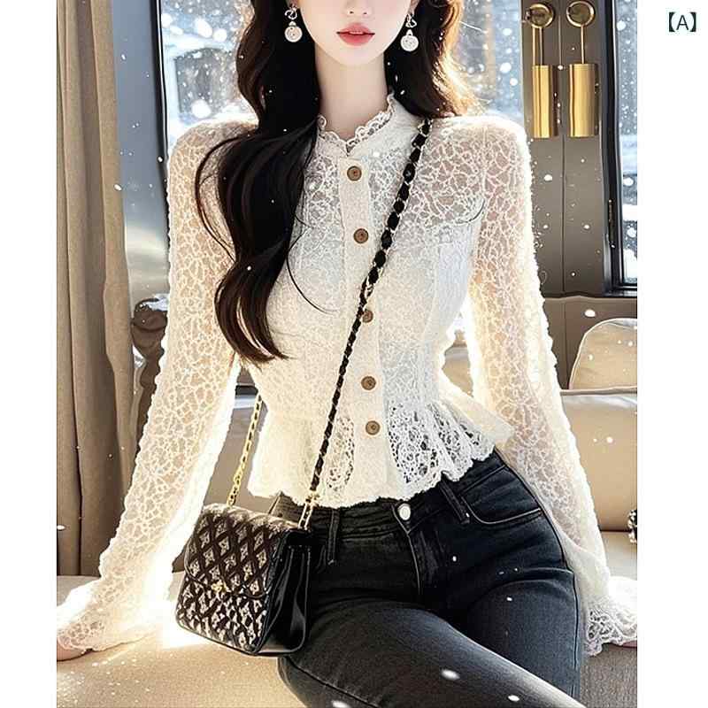 シャツ レディース 春夏 レースブラウス トップス 白 長袖 丸首 ポリエステル 普段使い 韓国風 かわいい きれいめ 通勤