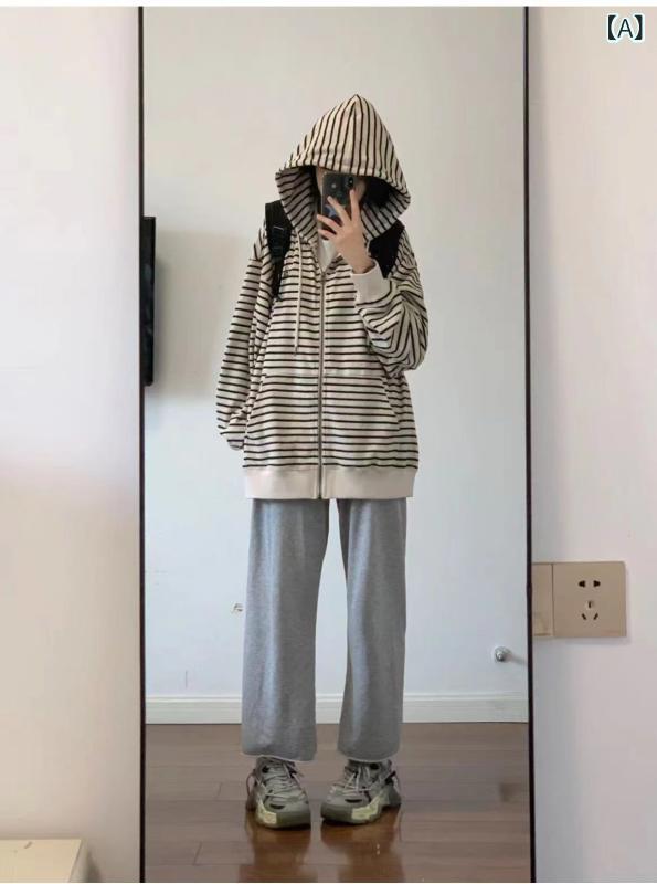 ・カテゴリ: 卫衣/绒衫・柄: 条纹/格子・スタイル: 日韩休闲、慵懒风、休闲・版型: 宽松型・着丈: ミドル丈(65cm超80cm以下)・袖丈: 長袖・袖のタイプ: 通常・ネックライン: フード付き・厚さ: 薄手・素材: 珠地棉・主な素材: 綿・主な素材の含有量: 70-80%・素材(詳細): ポリエステル30%以下・前開き: ジッパー・カラー: ストライプ・サイズ: M, L, XL, 2XL・ターゲット: 女性
