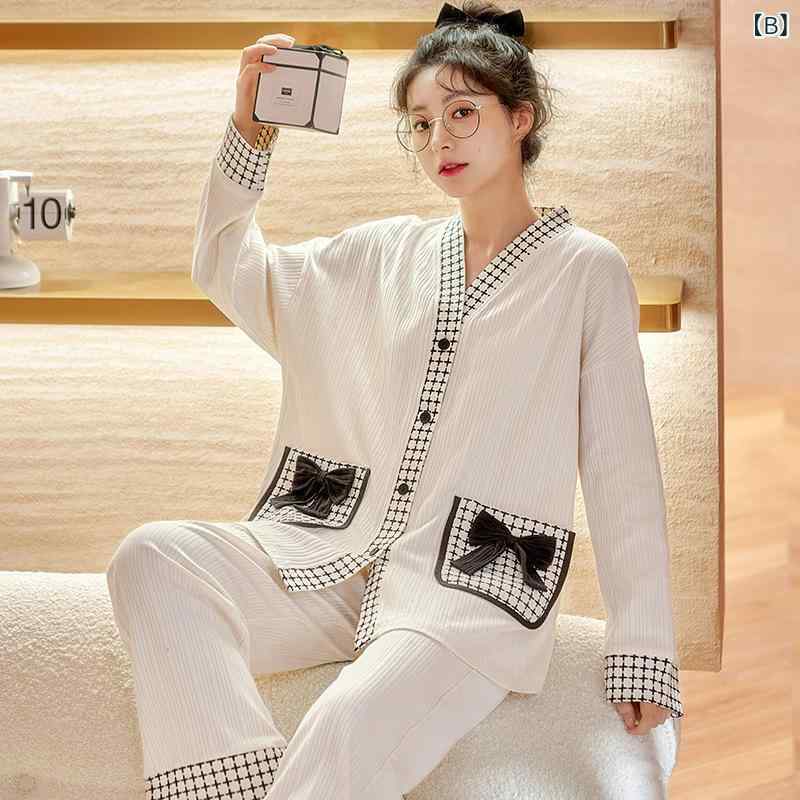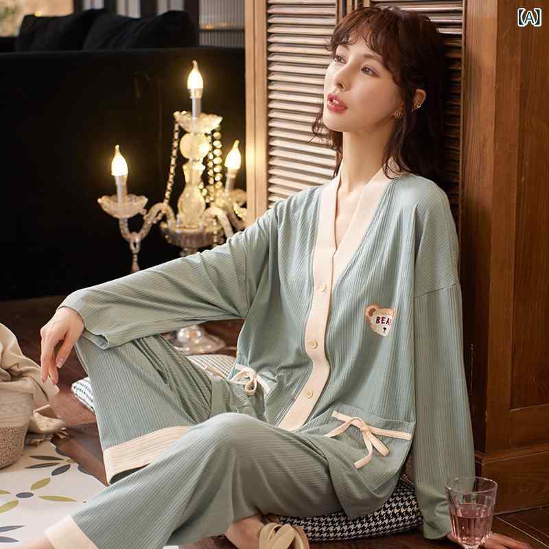 パジャマ レディース 春秋 長袖 Vネック カーディガン 和風 韓国風 かわいい 部屋着 ルームウェア ポリエステル 薄手 快適 浴場 普段使い