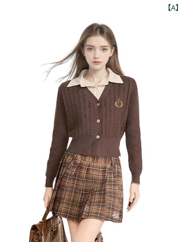ニット レディース カーディガン 学院風 配色 長袖 トップス カットソー 粘胶繊維 レーヨン 伸縮性 ブラウン系