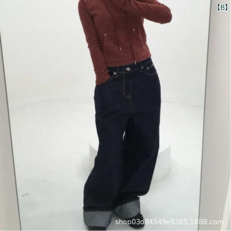 デニム レディース ワイド 高見え 春秋 高身長 ゆったり ストレート ジーパン ジーンズ パンツ 黒 紺 無地 普段使い 韓国風 かわいい おしゃれ