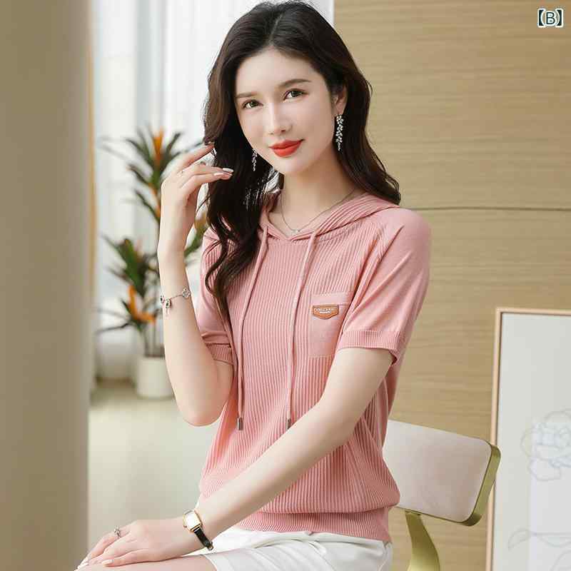 パーカー レディース 春夏 ニット 薄手 半袖 接触冷感 ゆったり トップス プルオーバー カットソー 無地 部屋着 普段使い かわいい 韓国風 カジュアル ピンク系