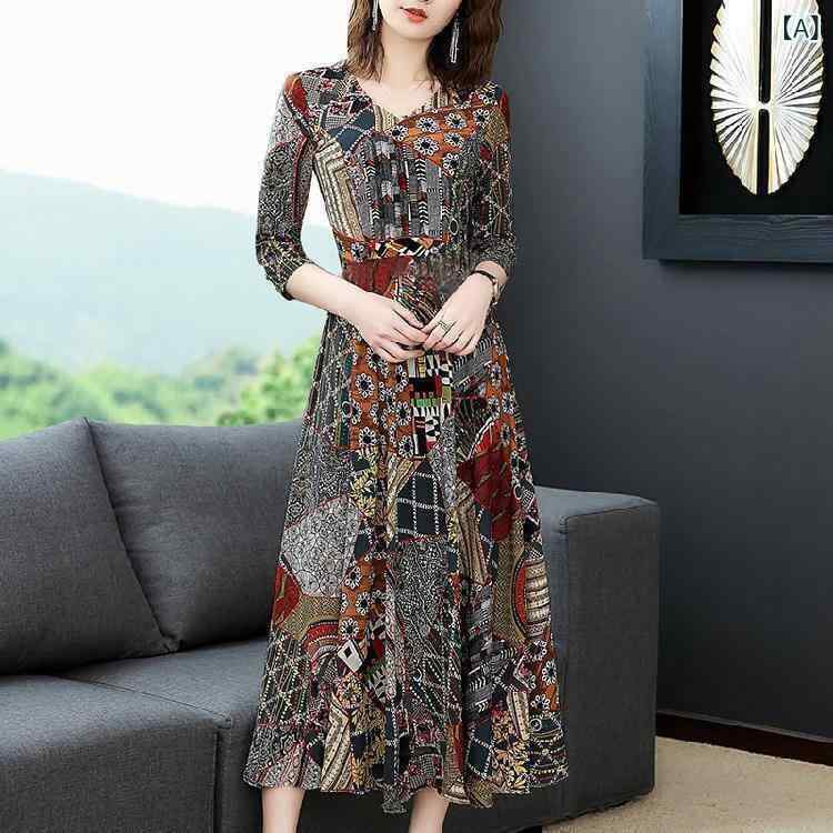 ワンピース レディース ママ向け 大きいサイズ Vネック 高腰 切り替え 花柄プリント チュニック ロング丈 ポリエステル ゆったり 普段使い かわいい 上品 清楚 半袖