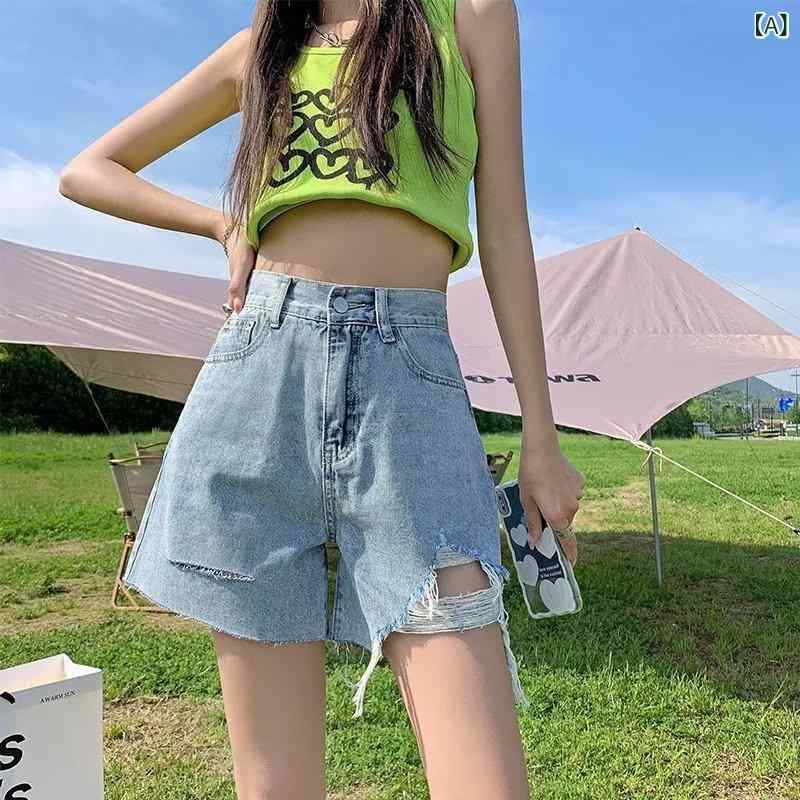 デニム レディース 韓国風 ハイウエスト Aライン 裾フリンジ ダメージ加工 デニム ホットパンツ 短パン ブルー 薄手 通勤 通学 普段使い S M L XL 2XL 3XL 4XL 5XL