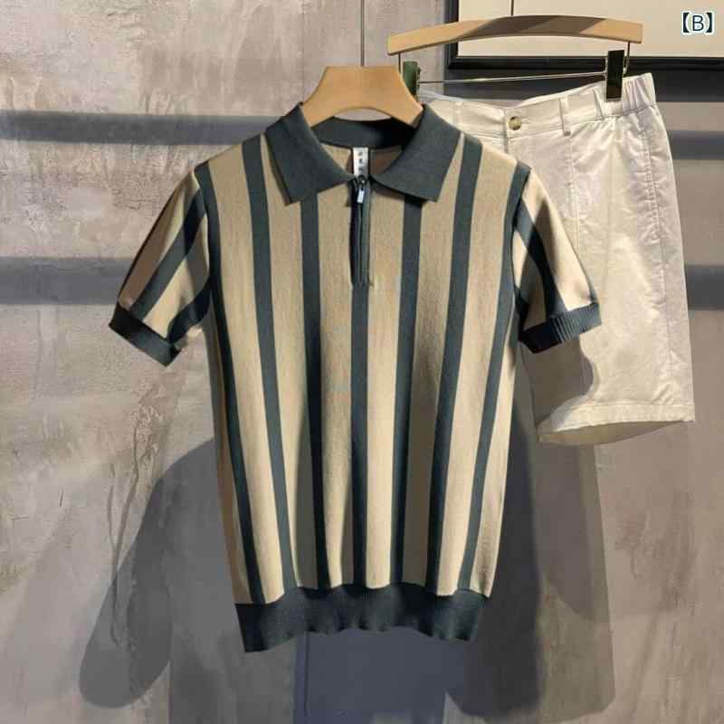 ポロシャツ メンズ 半袖 ニット スリムフィット ストライプ カジュアル カットソー トップス 接触冷感 吸湿速乾 カーキ色 グリーン ブラック