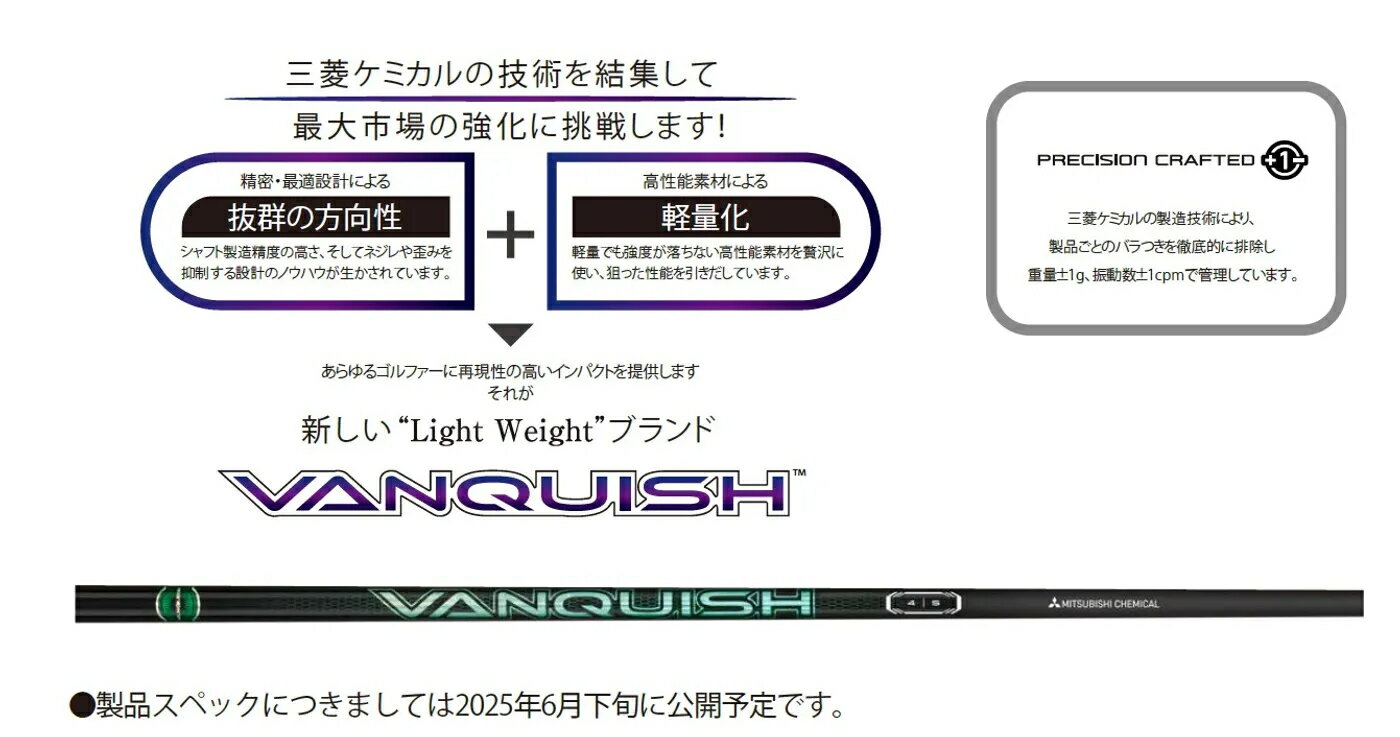 三菱の超精密軽量ブランド『VANQUISH』に、緑の中調子『VV(ヴィヴィ)』を追加。 三菱ケミカルから、新作ウッド用シャフトのアナウンス。 「超精密軽量ブランド『VANQUISH』の新モデルの追加ラインナップが決定! 2025年7月、三菱ケミカルは『VANQUISH VV(ヴィヴィ)』を発売いたします」と、同社。 三菱ケミカルの設計ノウハウと技術力の結集として生まれたVANQUISHは、 高弾性材料を含む数多くの材料の組み合わせを屈指することで、 本来軽量帯シャフトの開発では困難とされているしなやかなしなりと、高強度の両立を果たしました。 高品質・高性能の軽量ブランドに新たな選択肢としてスムースフィールの中調子モデルを追加ラインナップし、 幅広いプレーヤーニーズに応えます。 30〜50グラムという製造精度が問われる軽量モデルにもかかわらず、 振動数は「±1cpm」の高精度をキープしている。 【使用グリップ】トゥルーテンパー ICON 60R・ゴルププライド360・ゴルフプライド Plus4 Mid・G-REX55・カスタムグリップから選択可 ★カスタムグリップは以下のページよりカート追加いただき、 シャフトと共にご購入ください。 https://item.rakuten.co.jp/shaft-ing/c/0000000153/ ご不明点はお問い合わせにて対応させていただきます。 ★備考欄にご要望とモデル名をお書きください。選べるスリーブ付きシャフト!